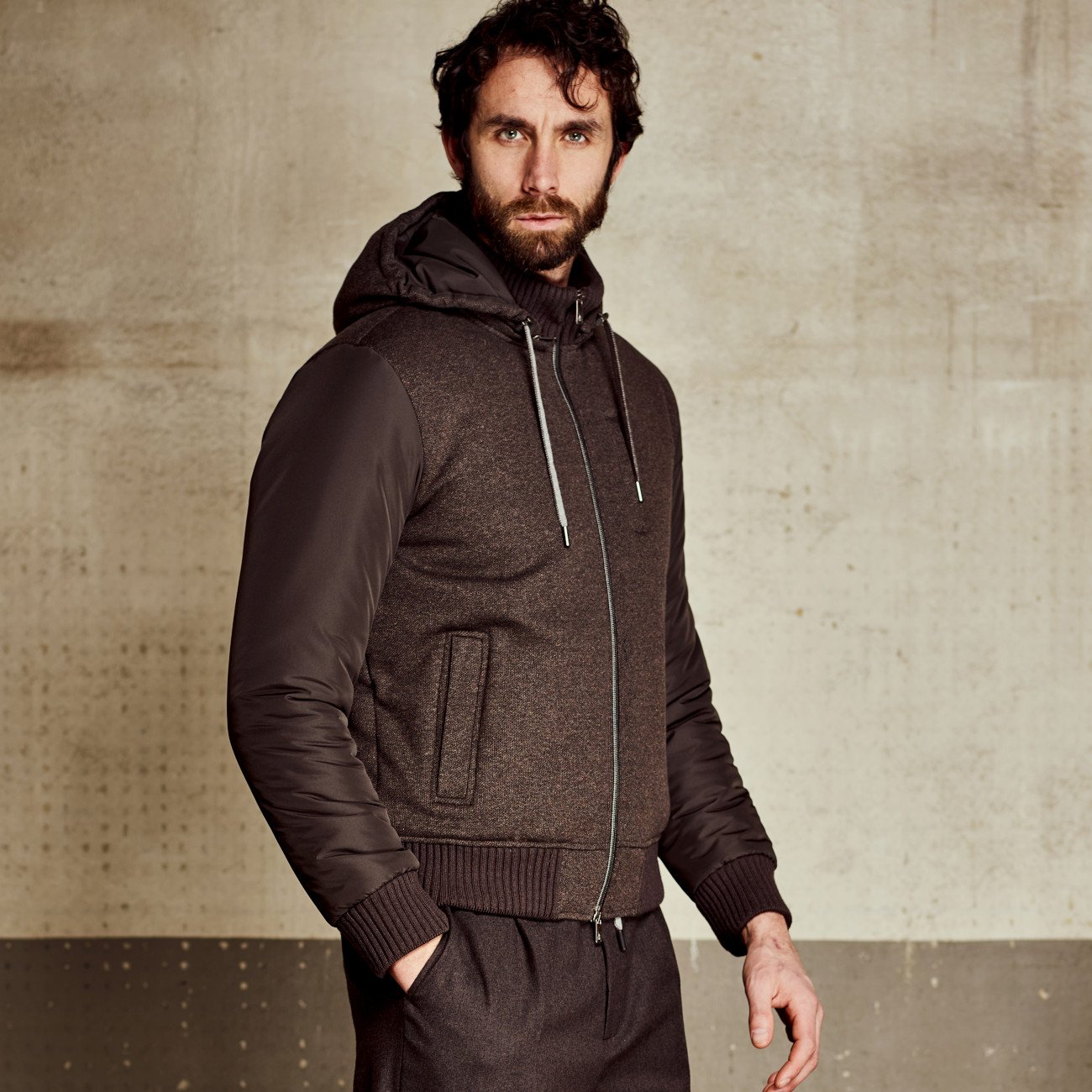 Comfort-Tech padded bomber jacket with detachable hood, crafted from elastic Jaspé Woolcot fabric—soft and comfortable, designed to offer protection and freedom of movement. The technical nylon sleeves are wind- and water-resistant, while the eco-friendly padding ensures warmth and lightness. Features include two zippered side pockets, a chest pocket with a branded zipper, and one inner pocket. The front zip with dual branded pullers is complemented by winter cotton ribbed trims at the cuffs, collar, and hem. The hood is detachable and adjustable, equipped with a drawstring and metal-branded stopper for practicality and protection. Inside, the pure cotton jersey lining promotes moisture absorption. A discreet metal logo plaque on the back of the collar subtly signs off the look.