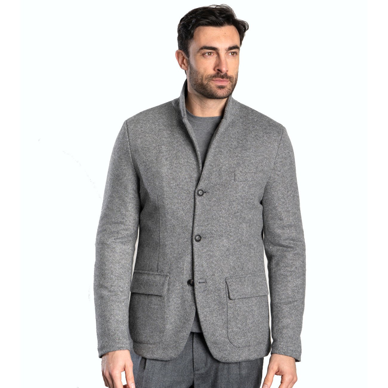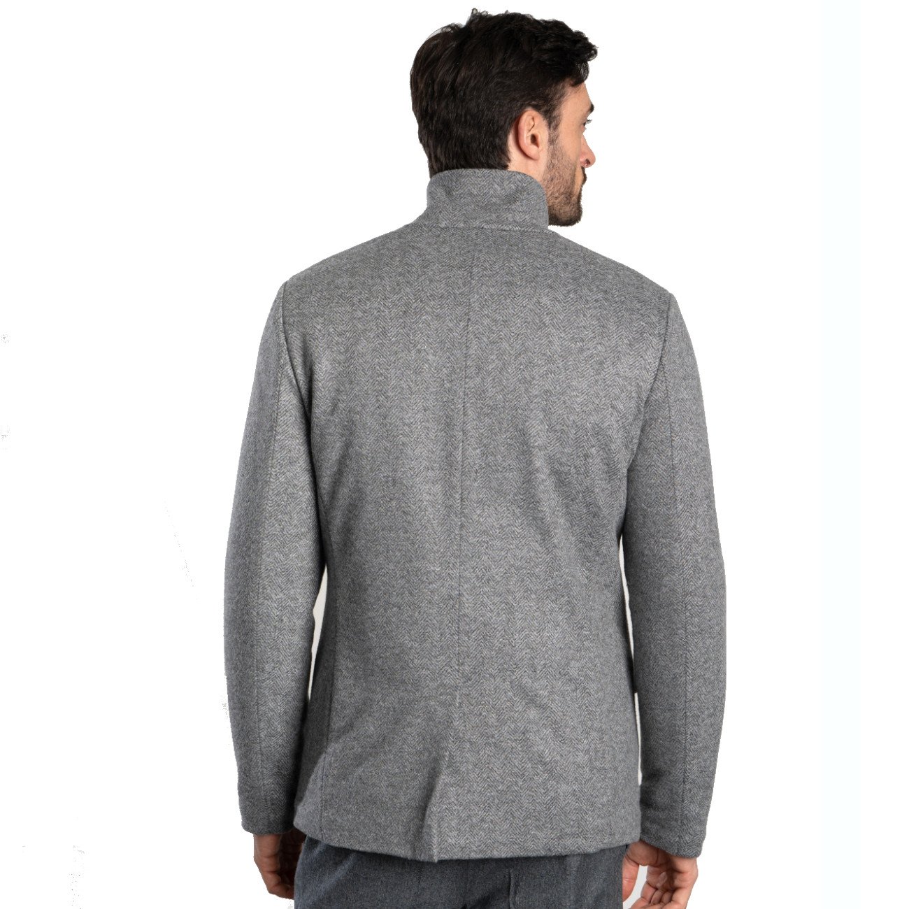 Warm and elegant padded jacket, crafted from soft brushed fabric with a Chevron pattern, offering comfort and protection on colder days. The inner polyester lining is wind-resistant, while the 80-gram Thermore padding ensures effective thermal insulation. The design is completed with branded buttons on the front, two flap side pockets, a chest pocket, and an internal zippered pocket. A metal logo plaque on the back of the collar adds a distinctive finishing touch.