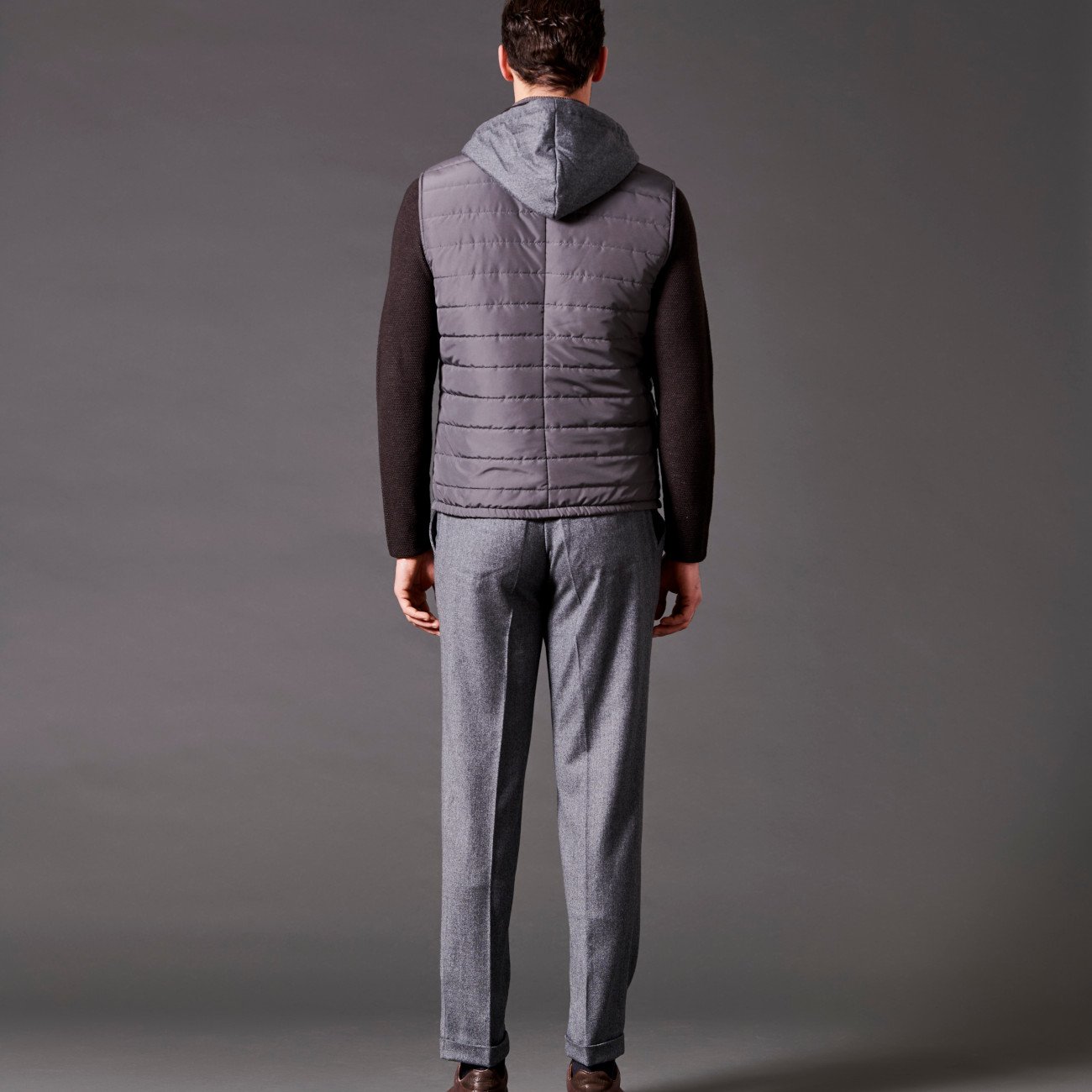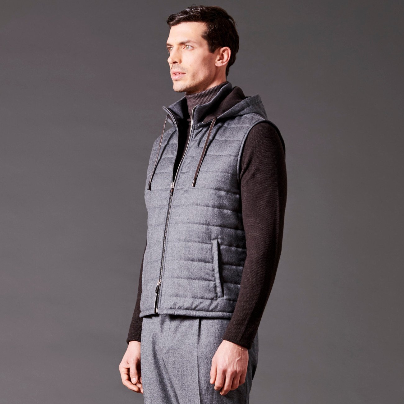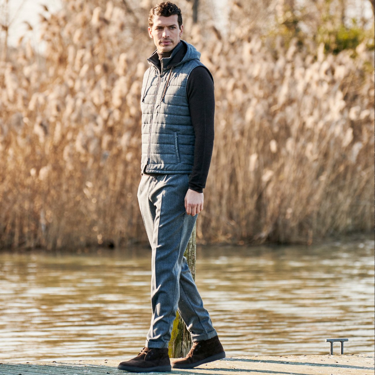 This casual-chic vest is crafted from luxurious Woolcot melange fabric, an elegant blend of wool and cotton that combines the natural warmth and breathability of wool with the softness and durability of cotton. The result is an exclusive material, soft to the touch yet remarkably resilient—ideal for a versatile garment made to be worn year-round. The windproof polyester back and lining offer effective protection against the elements, while the ultralight padding provides warmth without weighing you down. A double-branded zip closure adds a refined touch, while the metal logo plaque on the back of the collar elevates the design with distinctive style.
