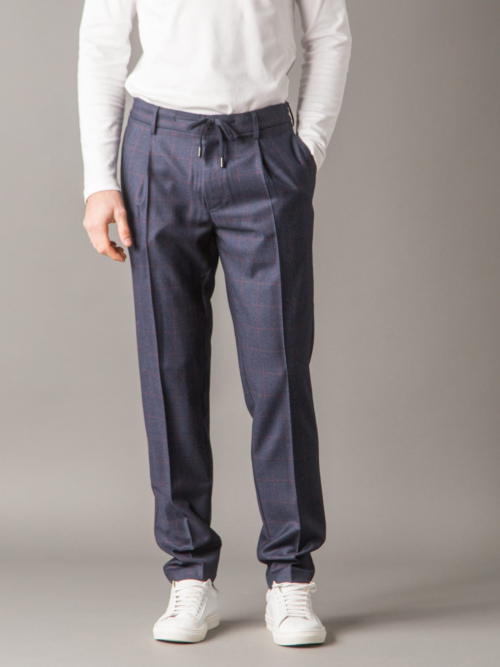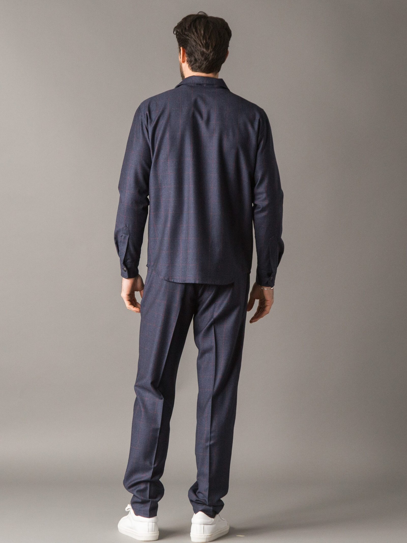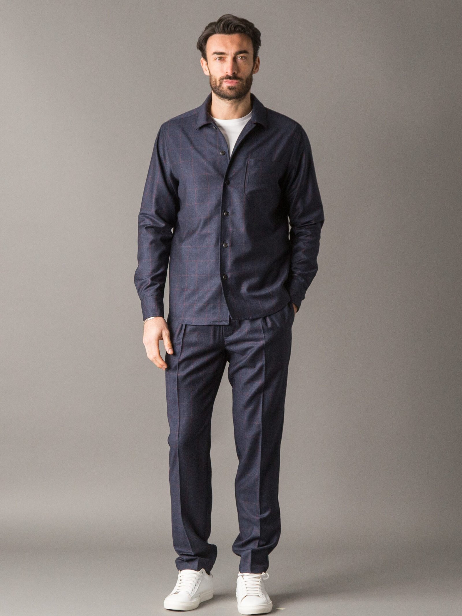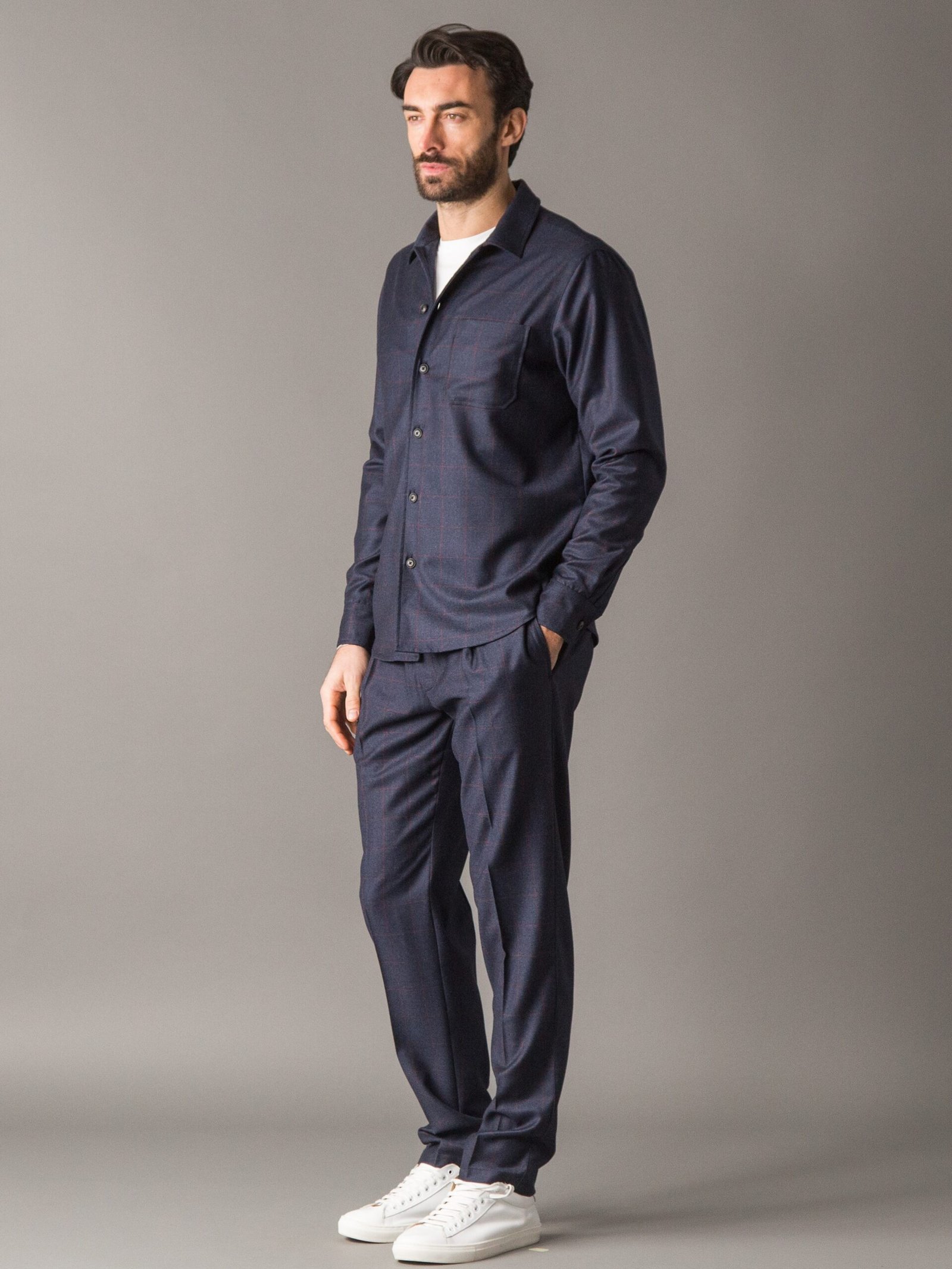 Coordinated set featuring a smart-chic overshirt and smart-luxury two-pleats easy pants, both crafted from premium extrafine pure Merino wool flannel with an elegant checkered pattern—naturally warm, soft, and refined. The overshirt includes logoed front buttons, a chest patch pocket, shirt-style bottom cut, and classic cuffs with logoed buttons. The pants feature two side pockets, two back pockets, and an elastic waistband with drawstring and logoed stopper for tailored comfort and sophistication.
