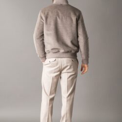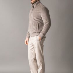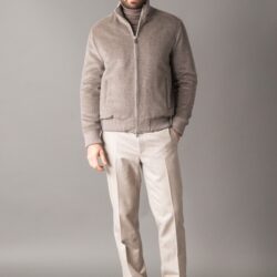 A refined and functional Bomber, crafted from warm and precious brushed velour in wool and alpaca, offering a soft and enveloping texture. The collar, cuffs, and bottom hem are finished with Cashwool knitted ribs, adding comfort and sophistication.The front metal zip is enhanced with Micronabuk piping and double logoed pullers. Two side pockets, one inner chest pocket, and a metal logo plate on the back collar complete the design. Padded with high-performance Climalight Ecowadding in recycled polyester, it provides warmth without bulk. The windproof lining in recycled polyester ensures protection and breathability. A bomber designed to face the cold season with bold style and premium materials.
