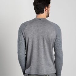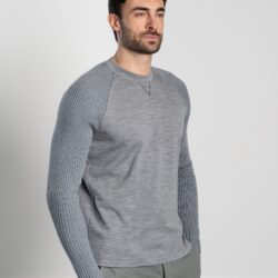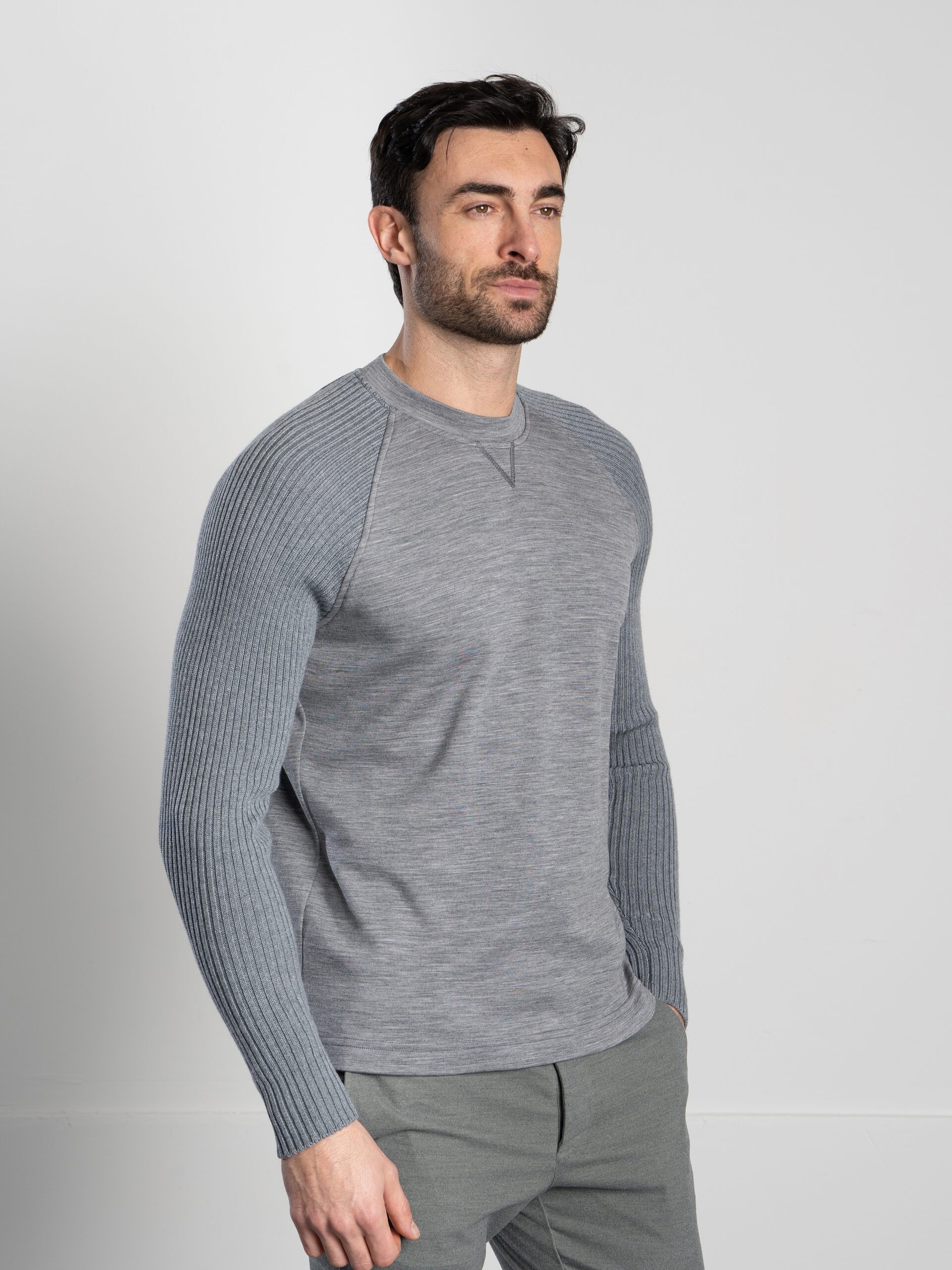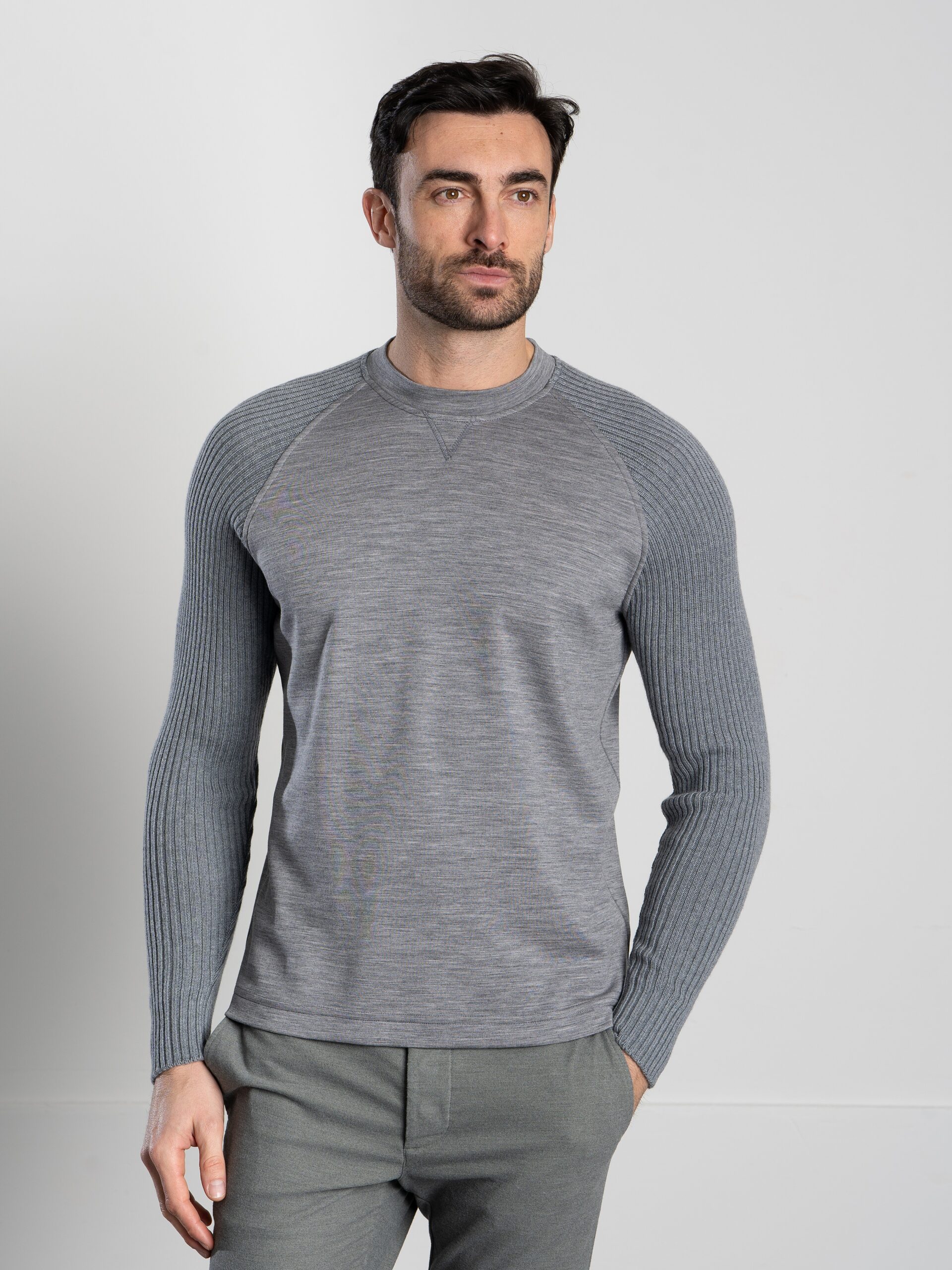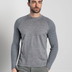 A refined and contemporary crew‑neck sweater crafted from soft, precious pure Merino wool fleece. The sleeves are made from rib‑knitted pure Merino wool, offering comfort, elasticity and a clean, structured look. A discreet metal logo plate on the back collar completes the garment with an elegant signature touch.