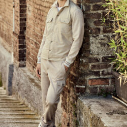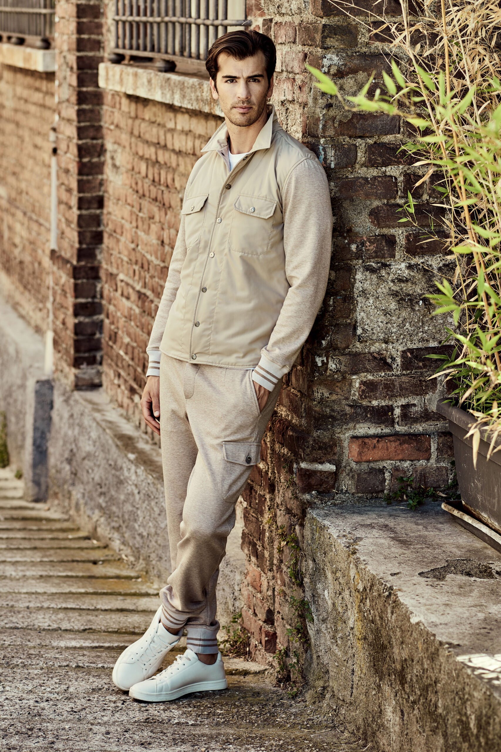 Sport-chic ensemble featuring a refined overshirt and pantacoulisse, perfect for a sophisticated and dynamic look. The overshirt is crafted from recycled eco-nylon and padded with ultra-light recycled silk wadding, ensuring warmth and lightness. The sleeves, made from light fleece in pure long-fiber cotton, feature fine ribbed knit cuffs with a double-stripe motif, adding a touch of elegance. It includes two chest pockets with flaps and branded snap buttons, a front closure with snap buttons, a shirt collar, and a slightly rounded hem. The pantacoulisse, made from yarn-dyed light fleece in pure Supima cotton with a two-tone effect, completes the set. Designed with two side pockets with branded zippers and a back pocket with branded buttons, it features a central leg rib for a refined detail. The elastic waistband with drawstring and branded clips ensures an adjustable fit, while the cuffed hem adds a distinctive touch. An ideal ensemble for those seeking the perfect balance between functionality and sophistication.