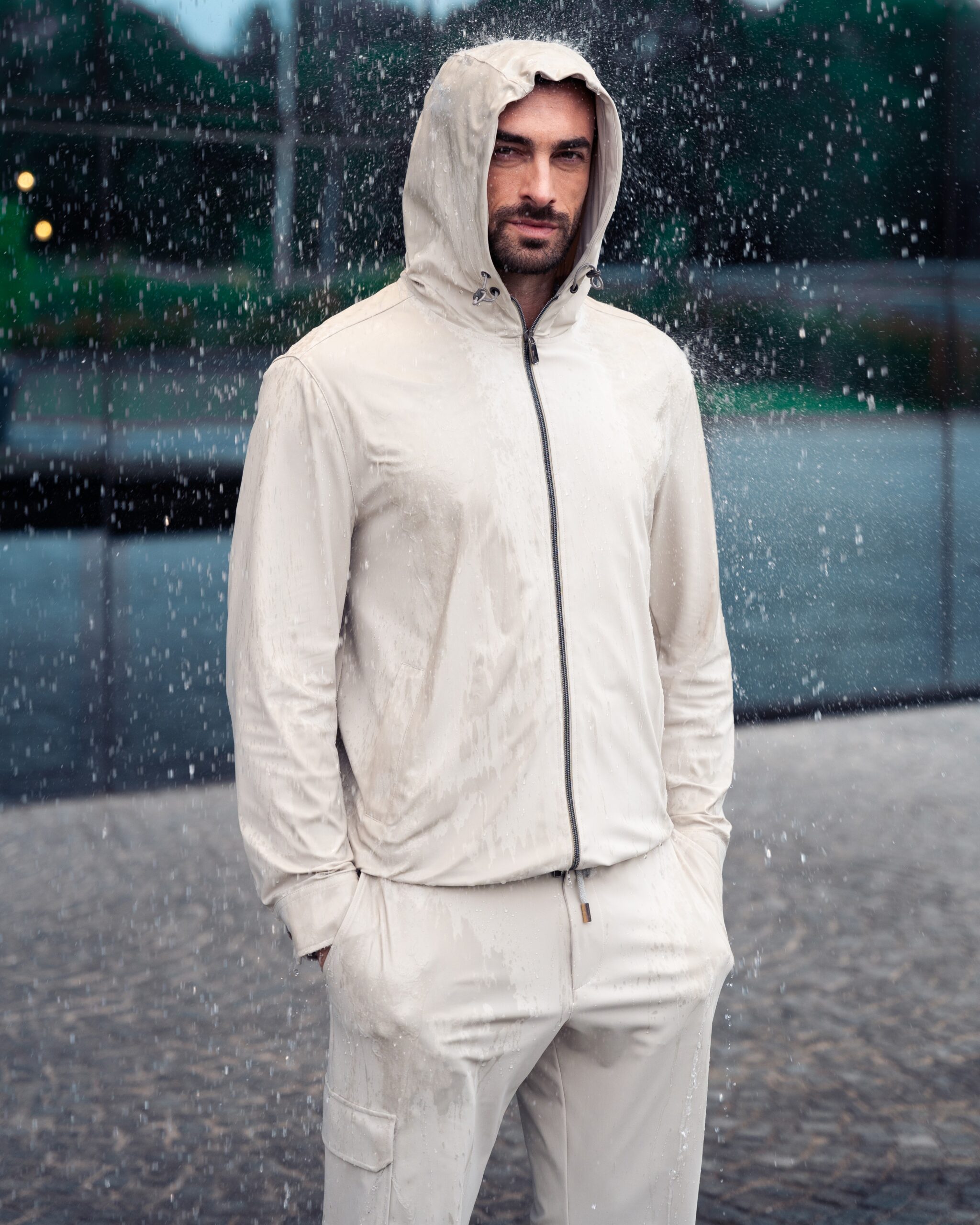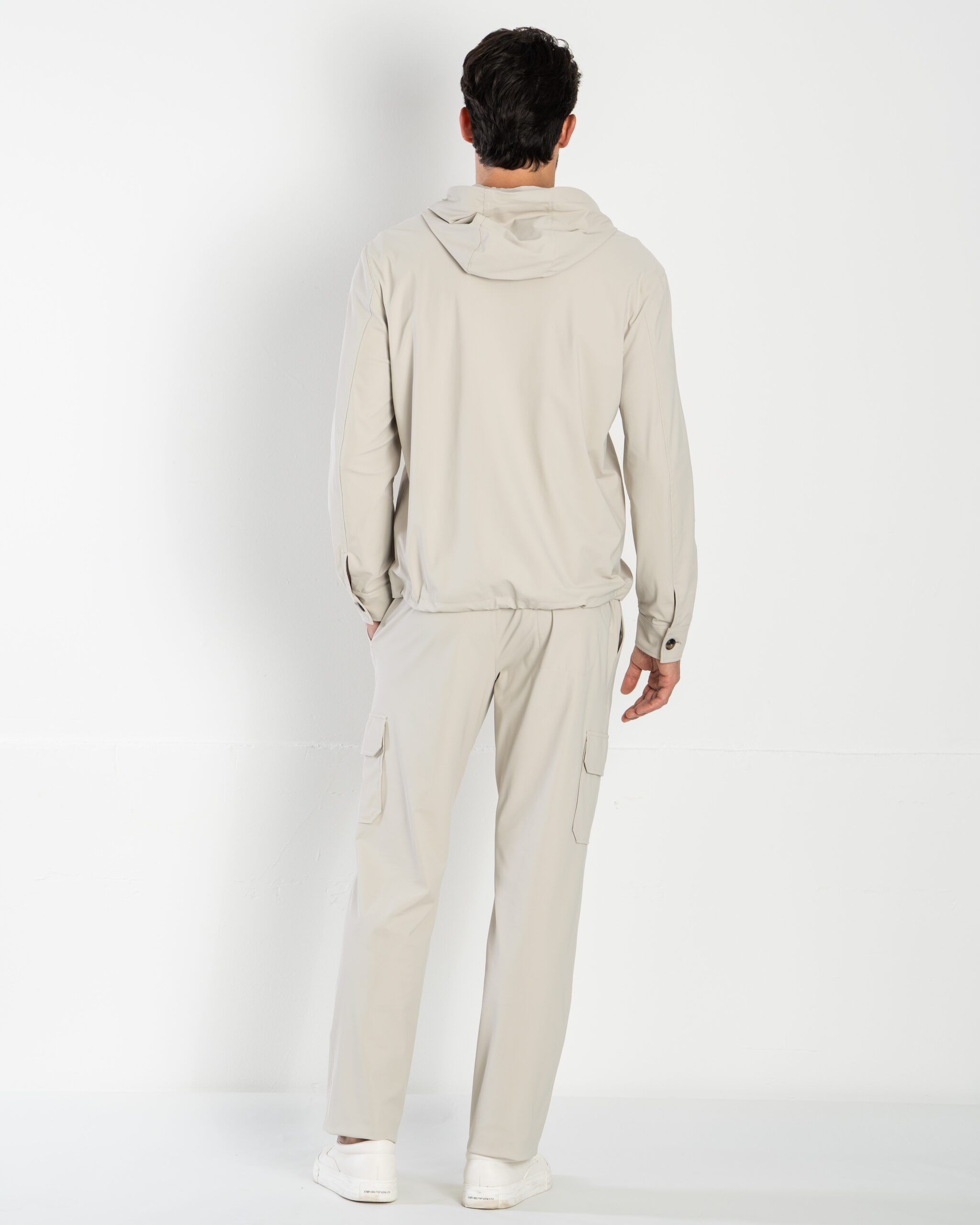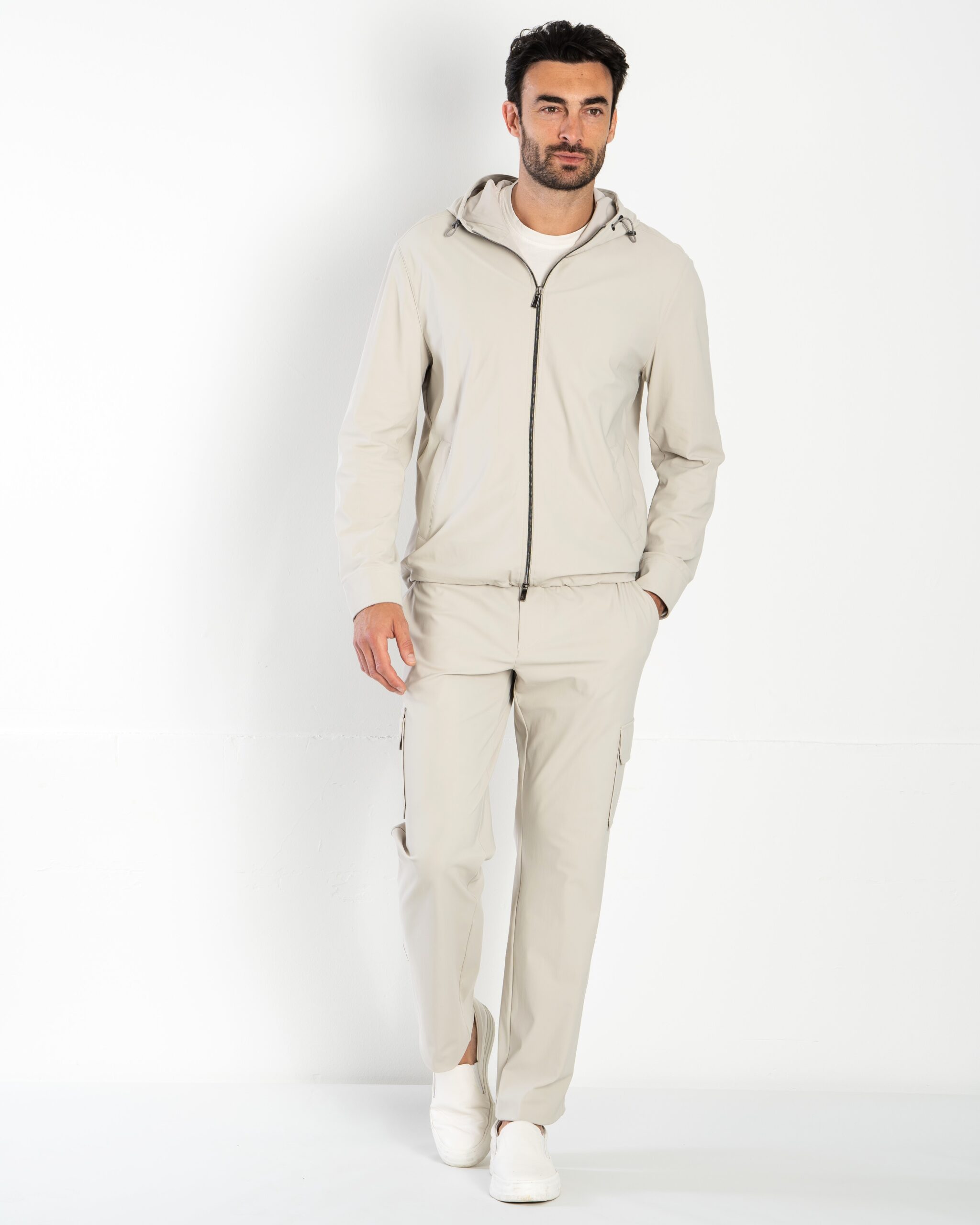 Sport-chic tracksuit set, combining comfort and functionality in a single versatile outfit. Made from Sensitive stretch technical fabric, this set boasts excellent properties such as breathability, quick-dry capability, wrinkle resistance, and antibacterial action, making it ideal for travelers or those seeking a flawless look in any situation. The set includes a hoodie with a front zipper featuring a double branded slider, an adjustable hood with drawstrings and clips, shirt-style cuffs, two zippered pockets, and a practical inner pocket. The cargo-style drawstring pants, also made of slightly elastic Sensitive fabric, offer a perfect blend of freshness and functionality, with two side pockets, two external flap pockets along the leg, two back pockets with branded buttons, and an adjustable waistband with elastic and drawstring, finished with branded clips.