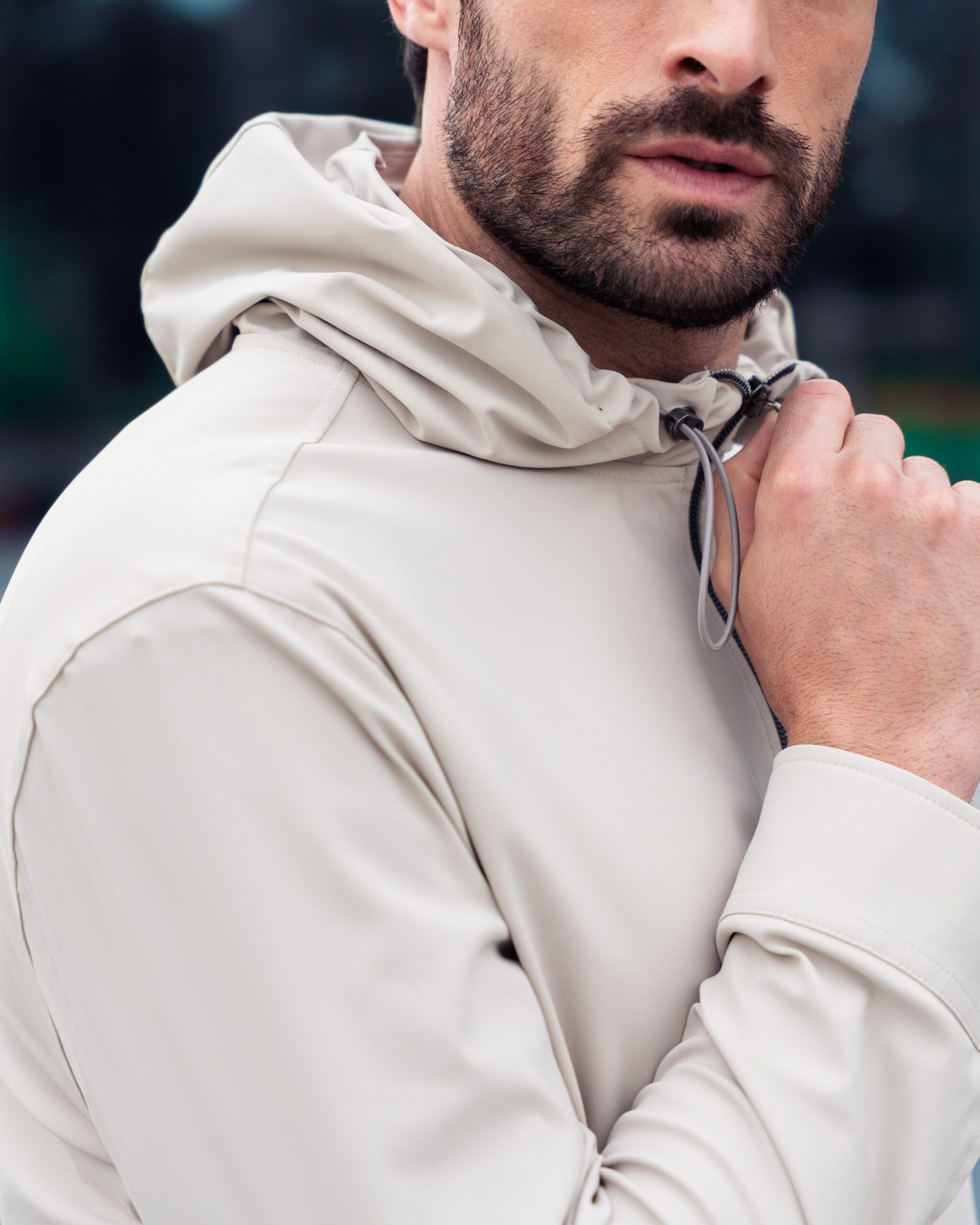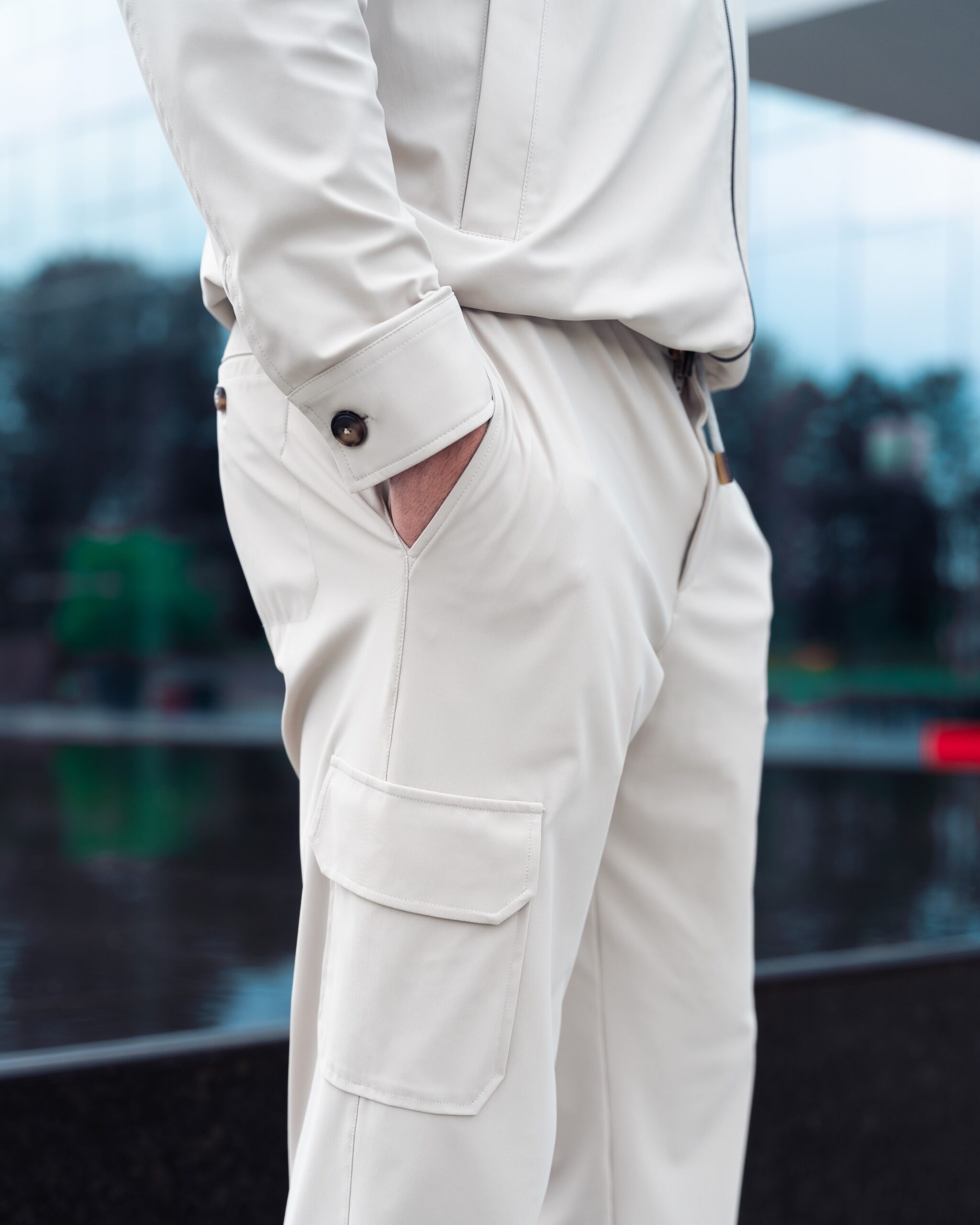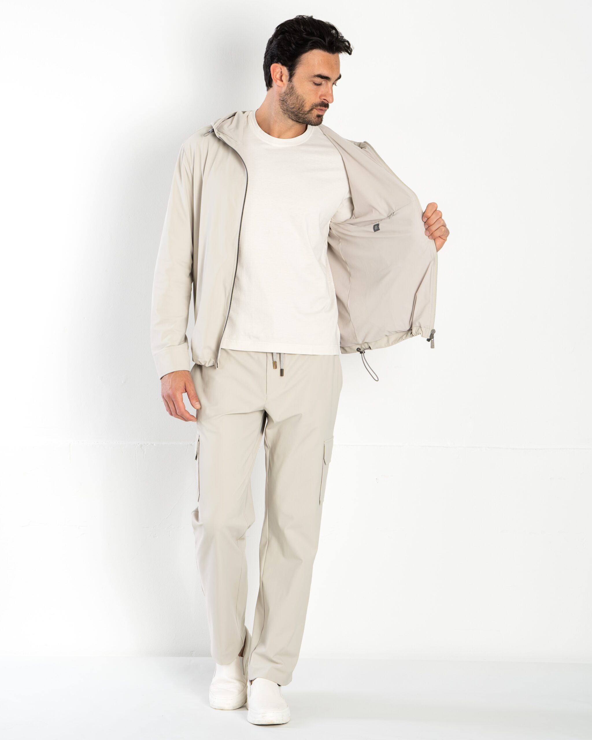 Sport-chic tracksuit set, combining comfort and functionality in a single versatile outfit. Made from Sensitive stretch technical fabric, this set boasts excellent properties such as breathability, quick-dry capability, wrinkle resistance, and antibacterial action, making it ideal for travelers or those seeking a flawless look in any situation. The set includes a hoodie with a front zipper featuring a double branded slider, an adjustable hood with drawstrings and clips, shirt-style cuffs, two zippered pockets, and a practical inner pocket. The cargo-style drawstring pants, also made of slightly elastic Sensitive fabric, offer a perfect blend of freshness and functionality, with two side pockets, two external flap pockets along the leg, two back pockets with branded buttons, and an adjustable waistband with elastic and drawstring, finished with branded clips.