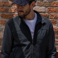 Fine and refined bomber jacket crafted from pure cotton yarn-dyed melange-effect soft jersey, enhanced by a suede front panel that adds elegance and character.