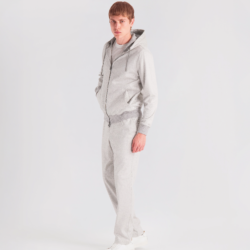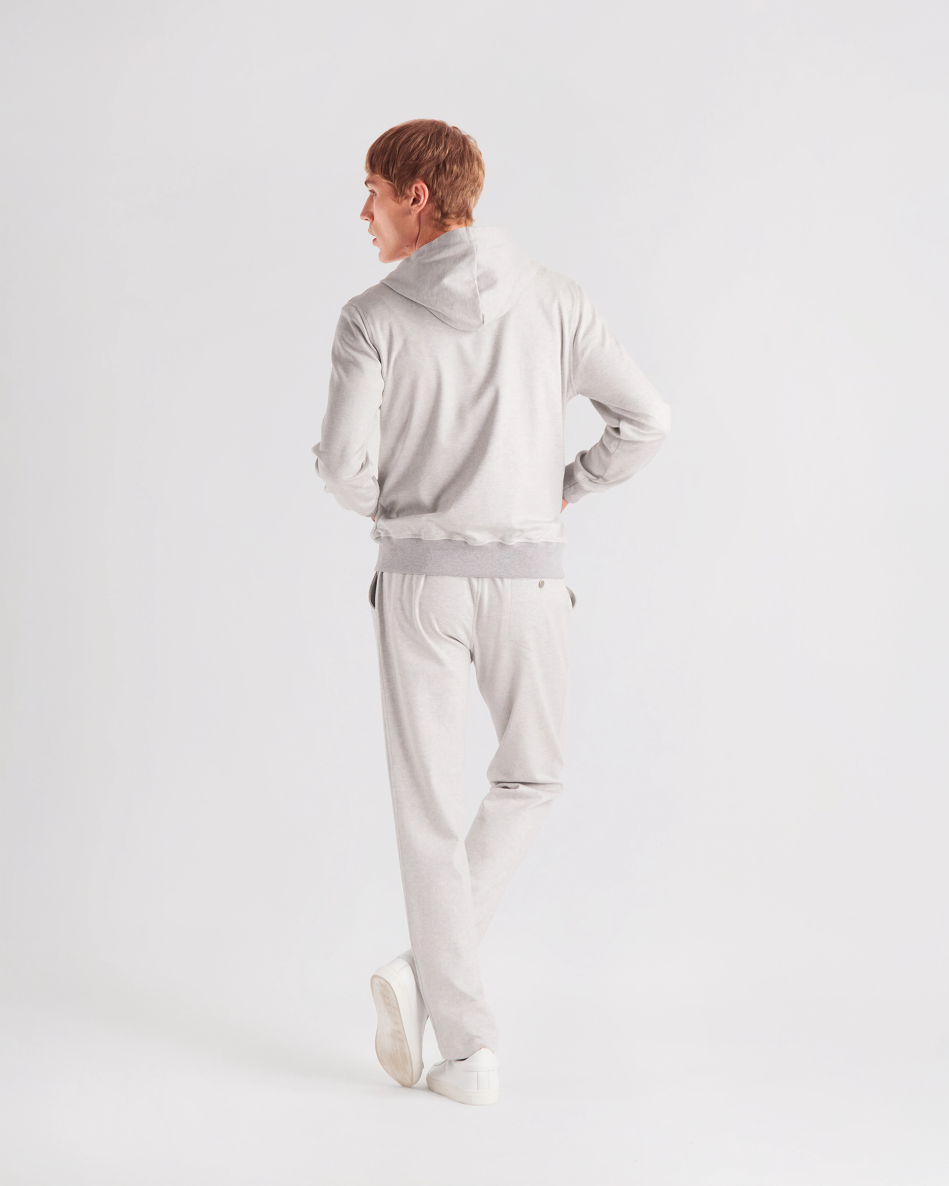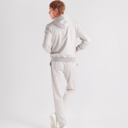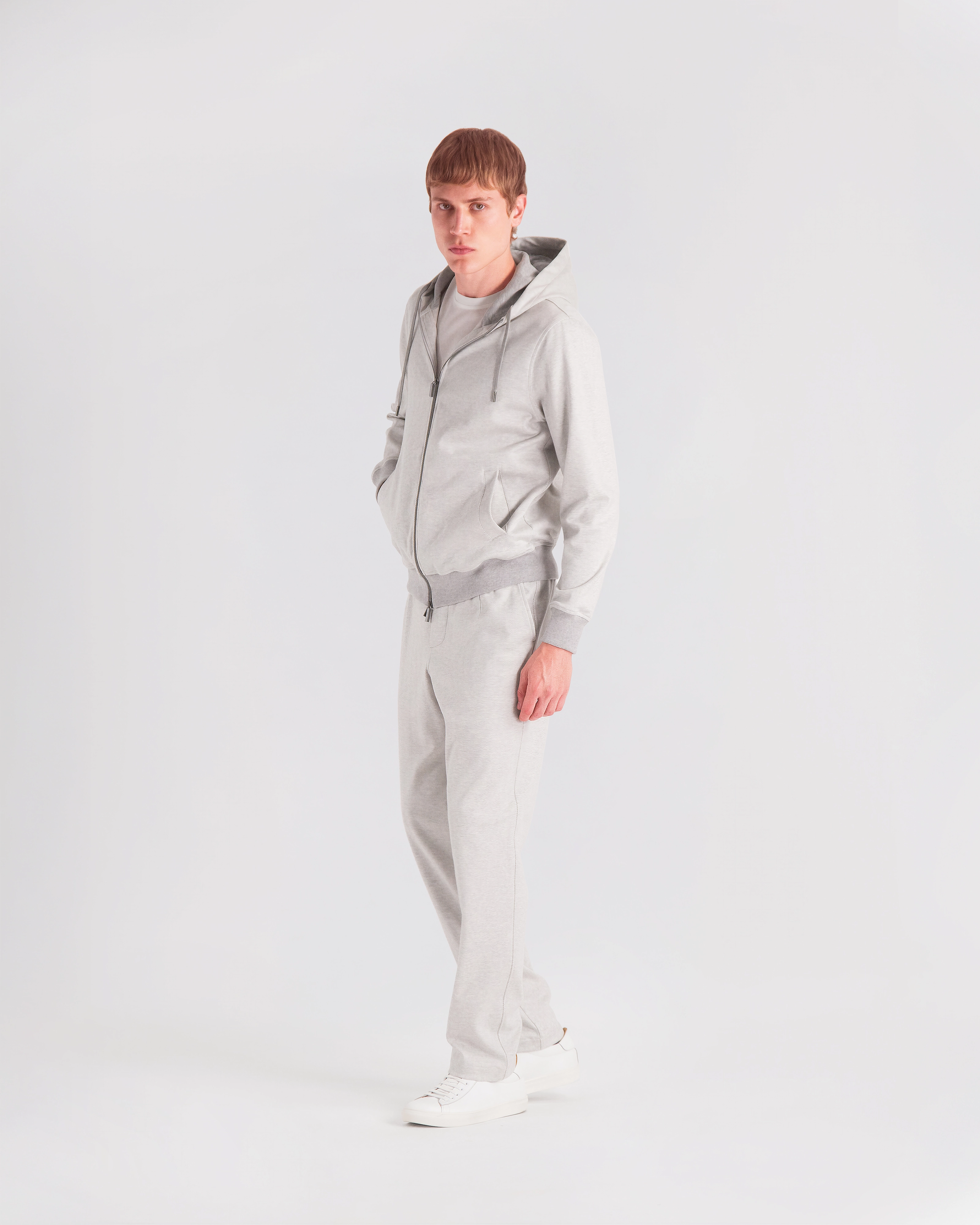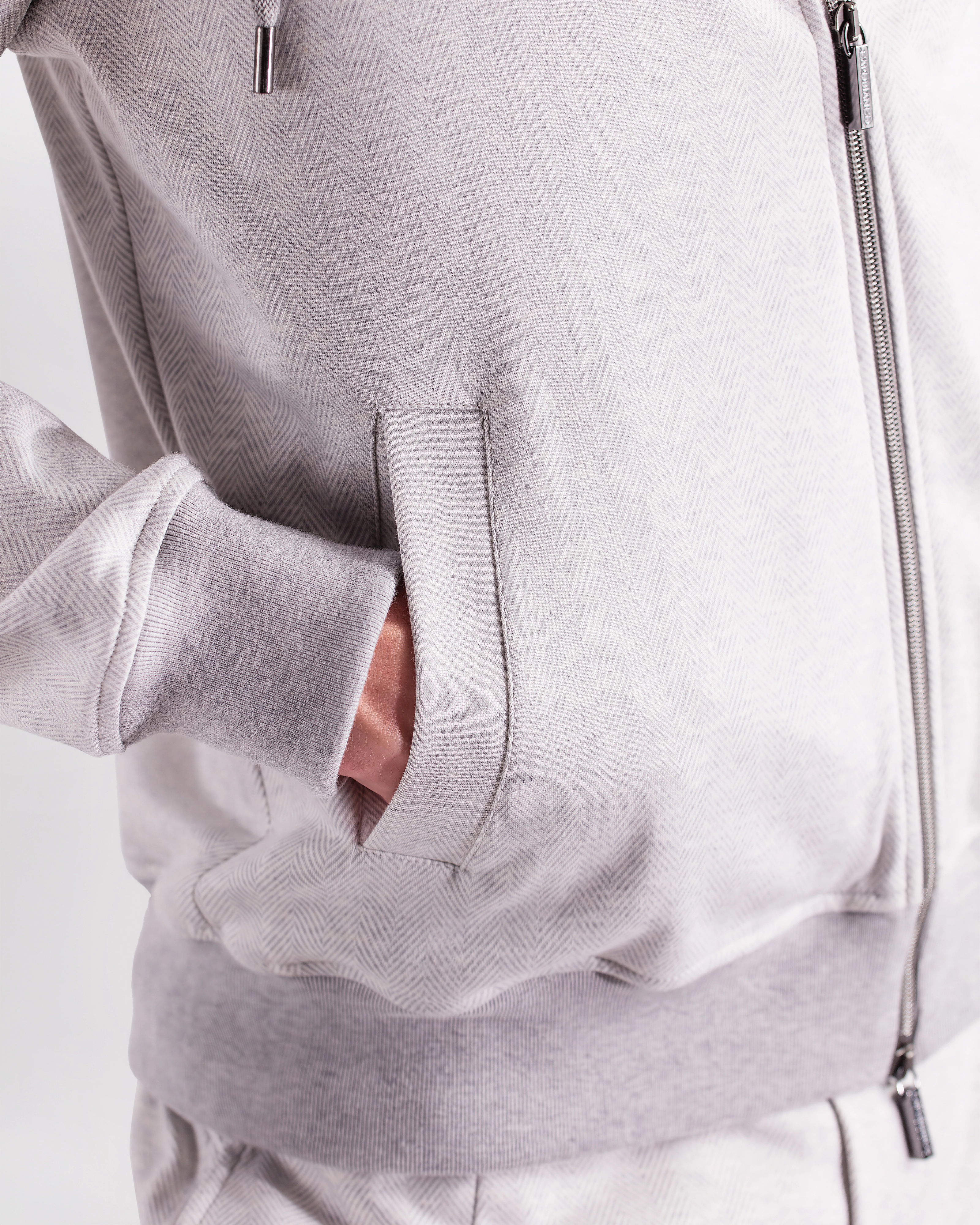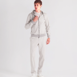 Leisure‑chic tracksuit consisting of a hooded full‑zip and sweatpants, crafted from soft pure Supima cotton soft‑jersey, yarn‑dyed in a mélange chevron pattern that enhances the fabric with a smooth touch, refined texture and naturally rich color depth. The hoodie, fully unlined for lightness and comfort, features a front zipper with logoed double sliders, an adjustable hood with drawstring and branded clips, fine ribbed cotton trims on hem and cuffs and two hip pockets. The matching sweatpants, made from the same Supima mélange jersey, include two hip pockets and a back pocket with logo buttons; the elastic waistband with drawstring and branded clips ensures an adjustable and comfortable fit. A casual‑chic set with a relaxed yet elevated attitude, enhanced by a premium fabric that blends softness, durability and a sophisticated appearance.