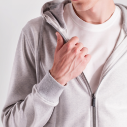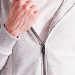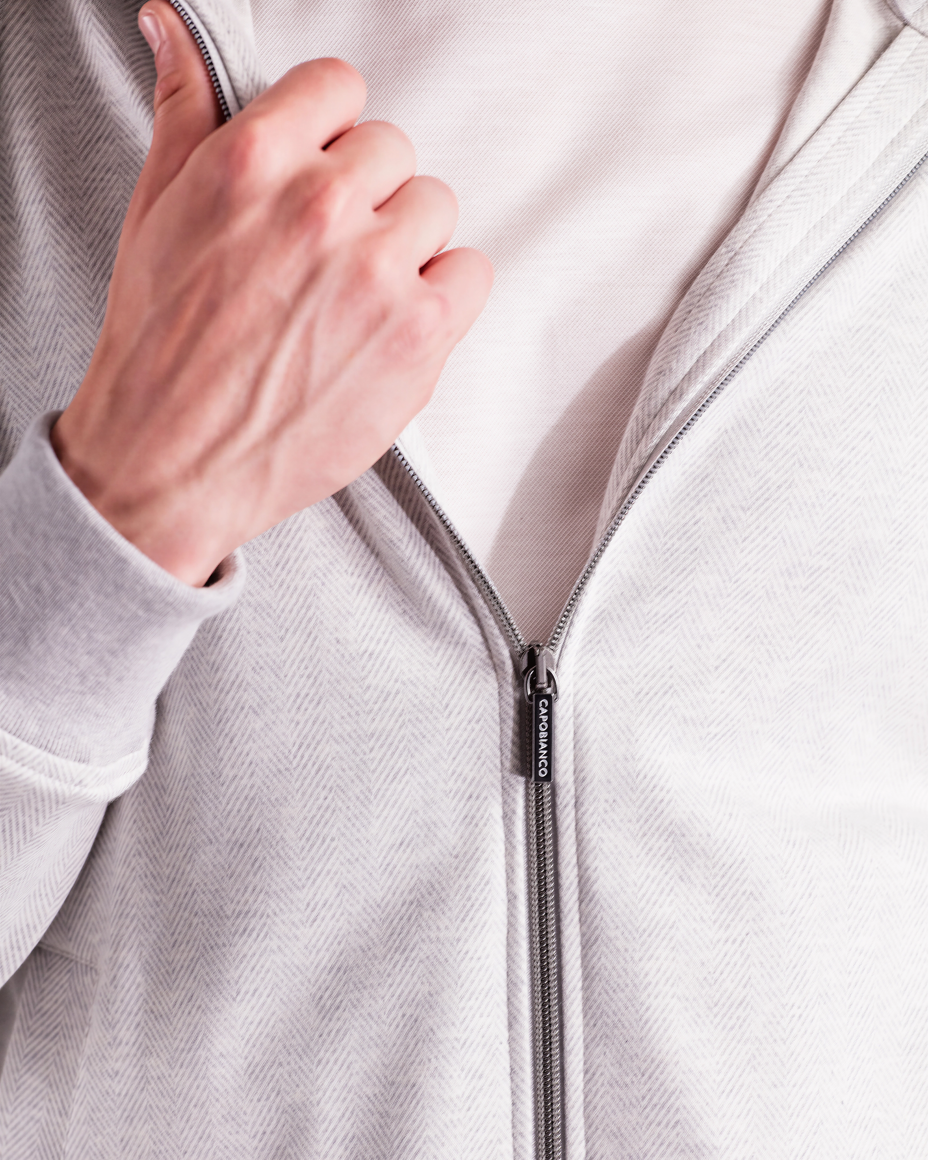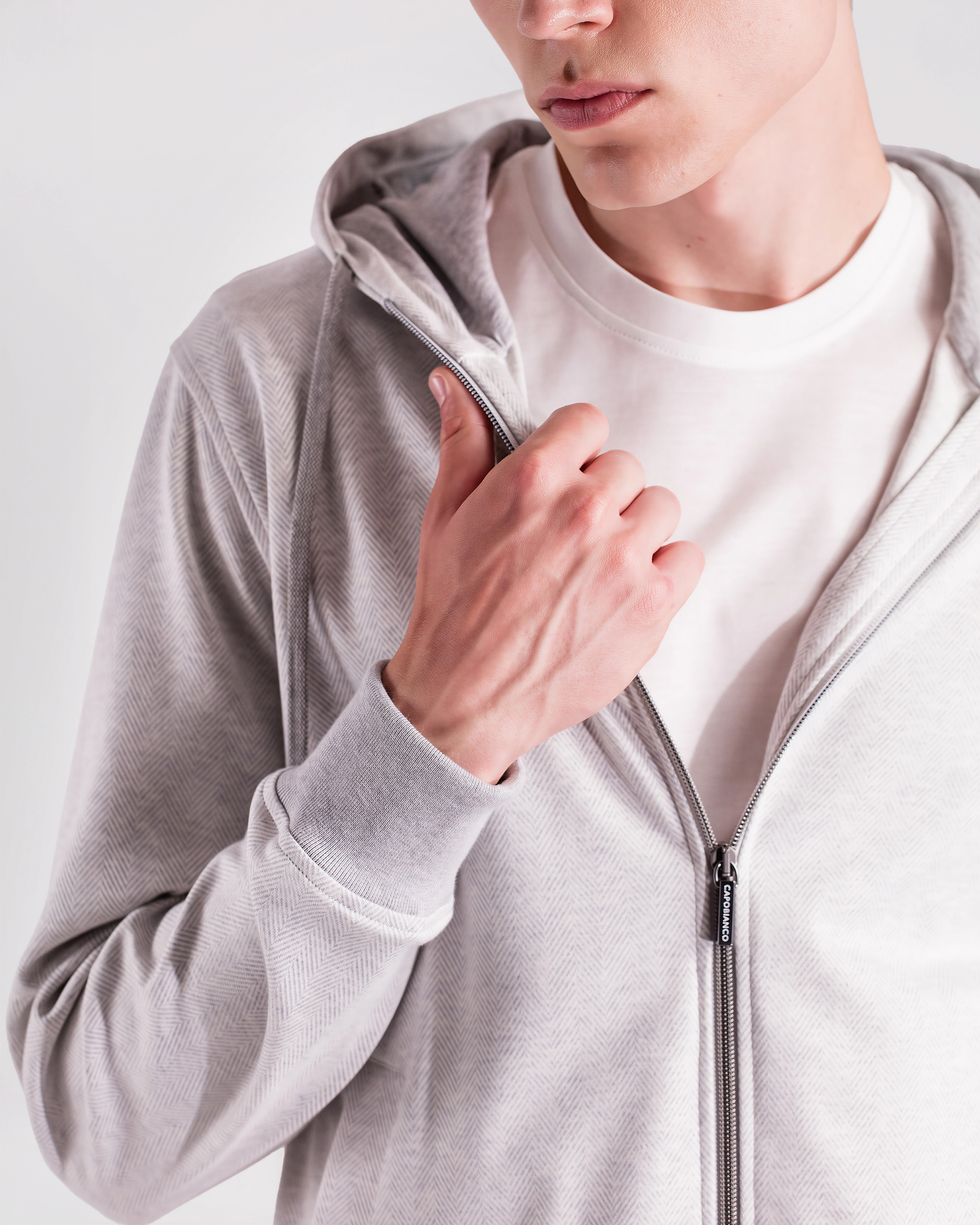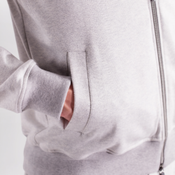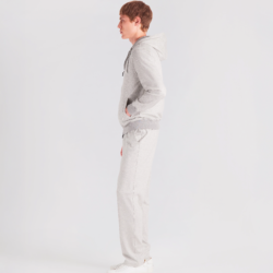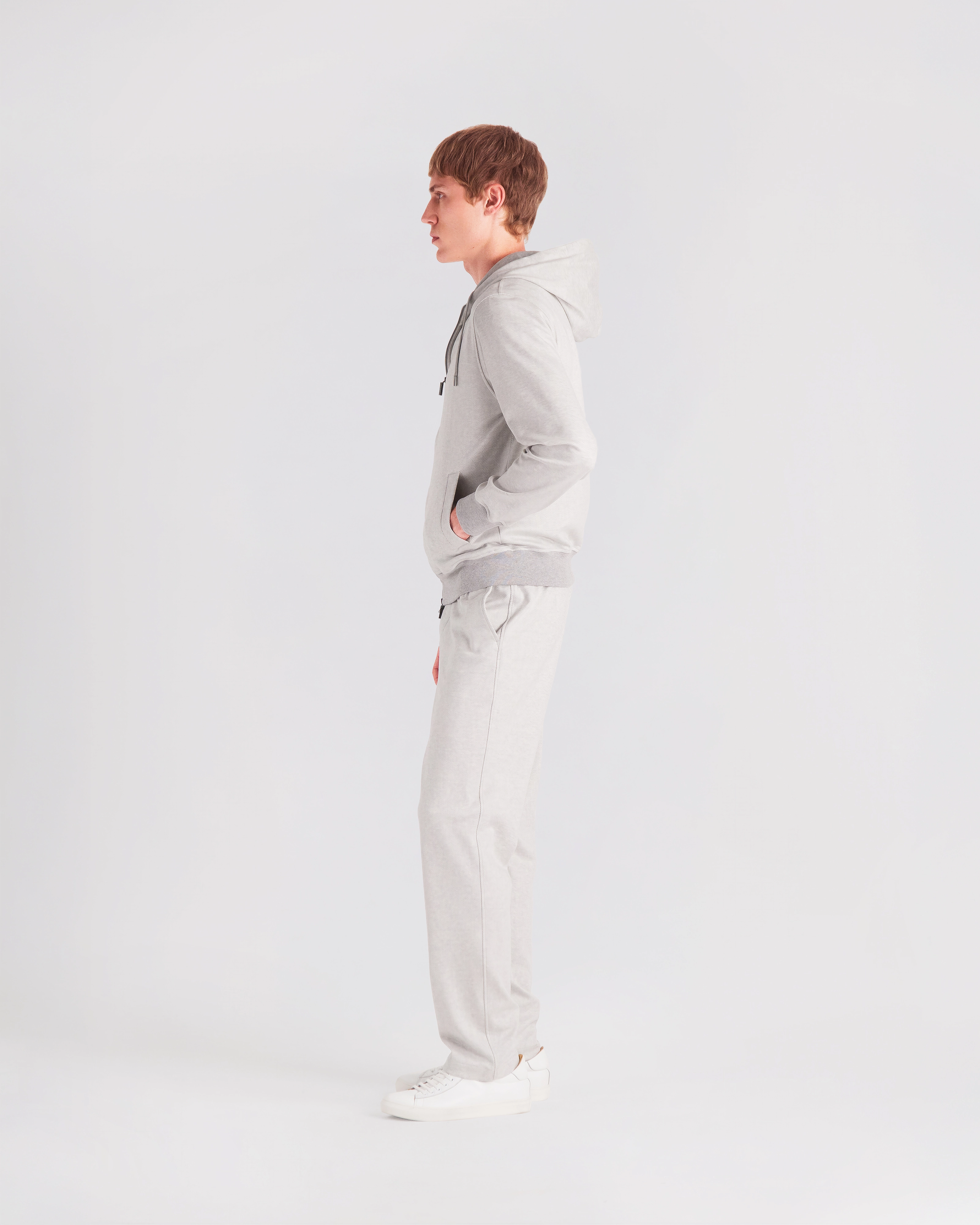 Leisure‑chic tracksuit consisting of a hooded full‑zip and sweatpants, crafted from soft pure Supima cotton soft‑jersey, yarn‑dyed in a mélange chevron pattern that enhances the fabric with a smooth touch, refined texture and naturally rich color depth. The hoodie, fully unlined for lightness and comfort, features a front zipper with logoed double sliders, an adjustable hood with drawstring and branded clips, fine ribbed cotton trims on hem and cuffs and two hip pockets. The matching sweatpants, made from the same Supima mélange jersey, include two hip pockets and a back pocket with logo buttons; the elastic waistband with drawstring and branded clips ensures an adjustable and comfortable fit. A casual‑chic set with a relaxed yet elevated attitude, enhanced by a premium fabric that blends softness, durability and a sophisticated appearance.