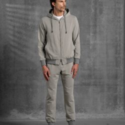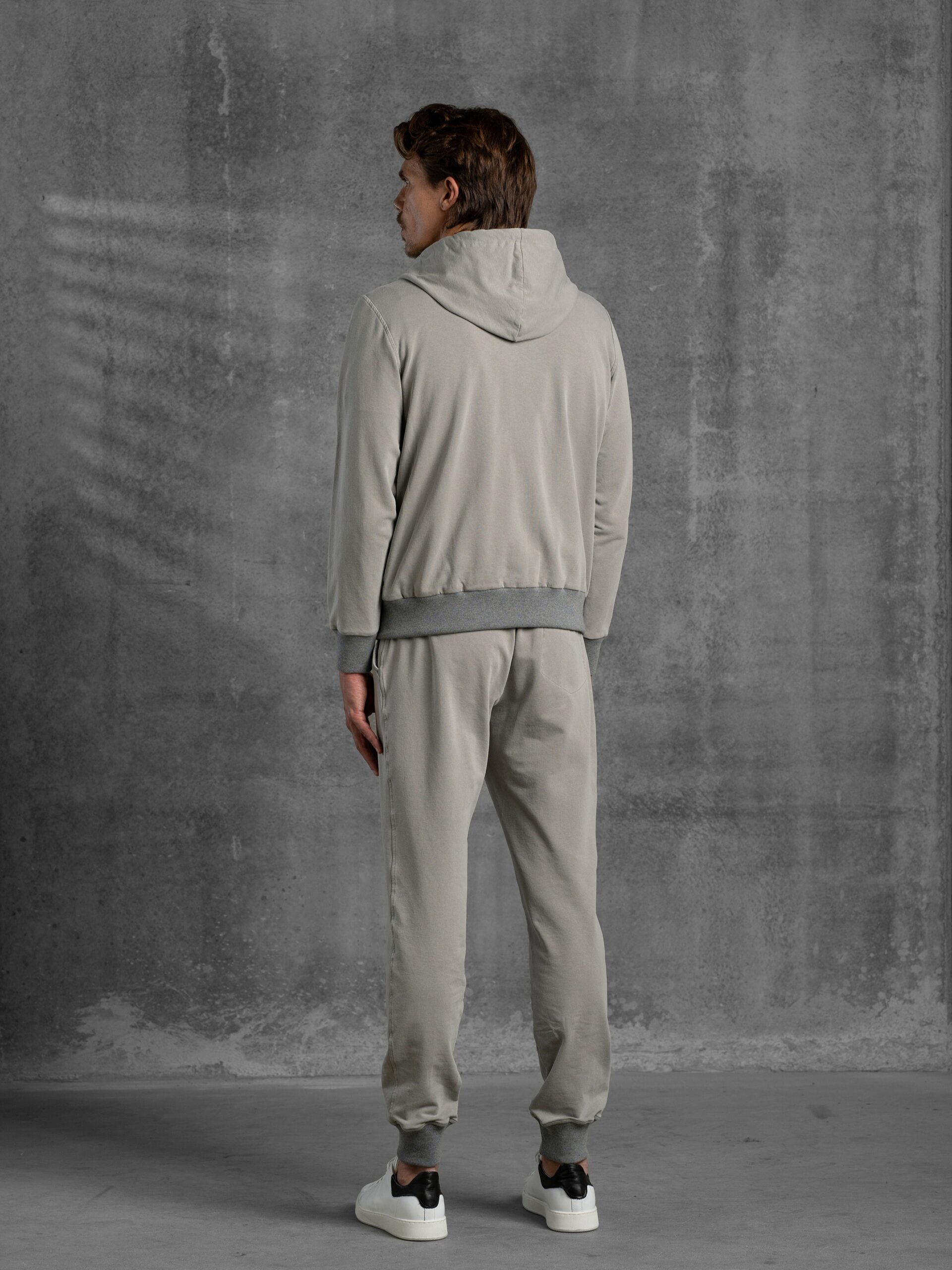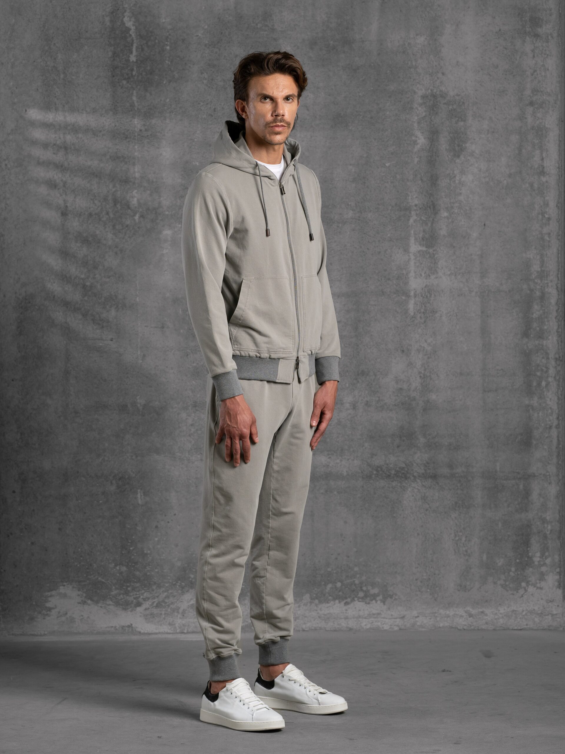Tracksuit consisting of a full zip hoody and sweatpants, crafted from lightly stretch pure cotton jersey, a soft, natural and flexible fabric that ensures comfort, breathability and ease of movement. The entire set is garment dyed using an eco‑friendly earth‑based technique inspired by ancient dyeing methods and completely free from chemicals, giving the color a unique, authentic and naturally textured appearance. The hoody features a front zipper with double logo pullers, an adjustable hood with branded stoppers, fine ribbed cotton trims, two hip pockets and an inner chest pocket; the interior is lined in lightweight pure cotton jersey for added comfort. The sweatpants include ribbed cuffs, two hip pockets and a back pocket with logo buttons; the elastic waistband with drawstring and branded clips provides an adjustable fit. A versatile, sustainable and refined tracksuit, perfect for those who appreciate superior fabrics and a conscious casual style.