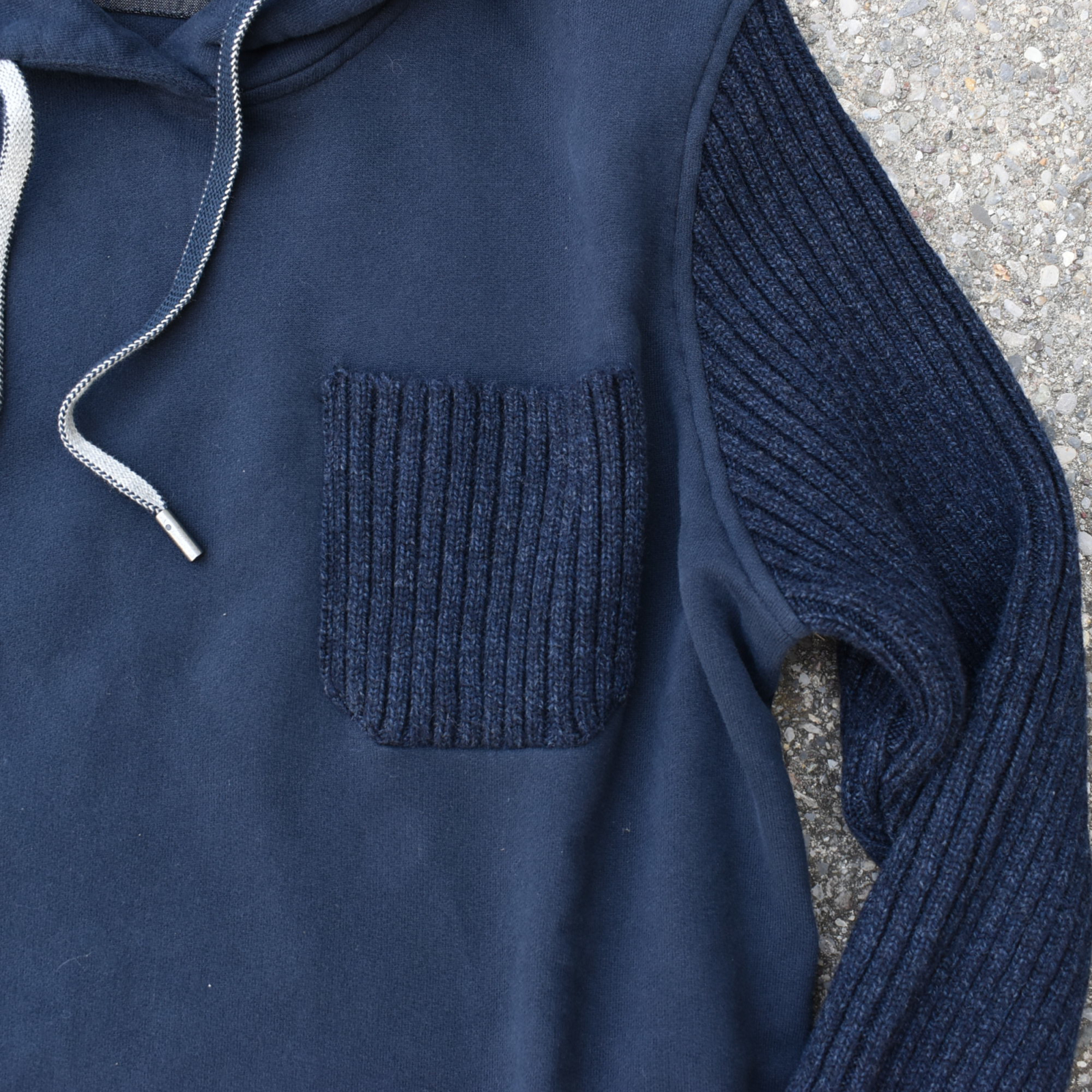 Casual and chic hoodie, made of brushed pure cotton fabric, soft and comfortable. The sleeves and the chest pocket are made of knitted wool and cashmere ribbing. The sweatshirt features a drawstring with a logo stopper and a metal logo plate on the back of the collar. The eco-friendly vegetable-based dyes used for garment dyeing, grown regeneratively, not only demonstrate a commitment to sustainability but also improve skin well-being.
