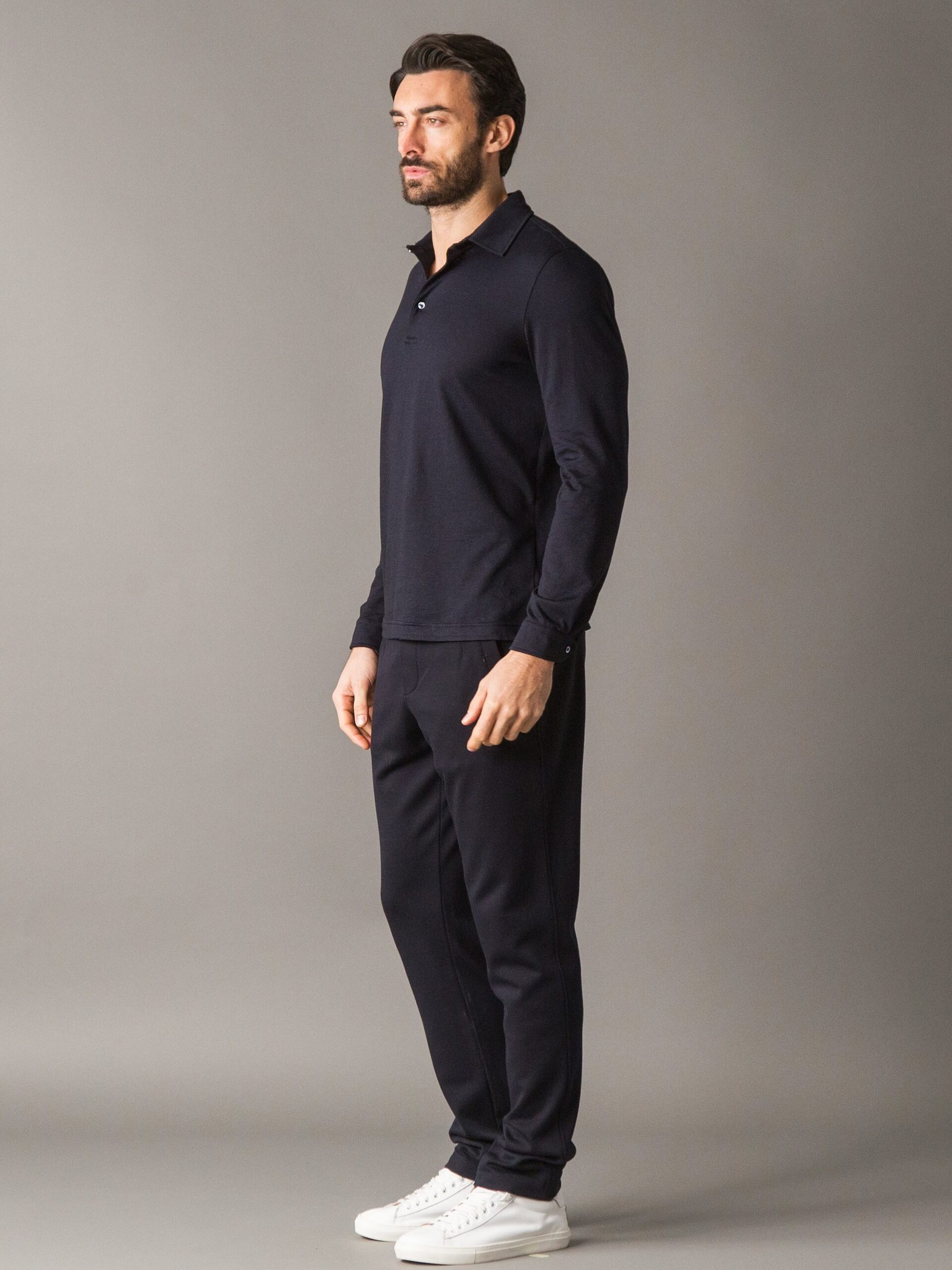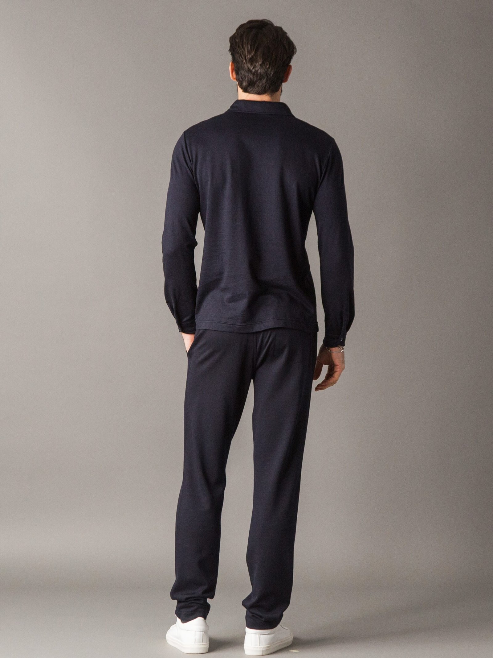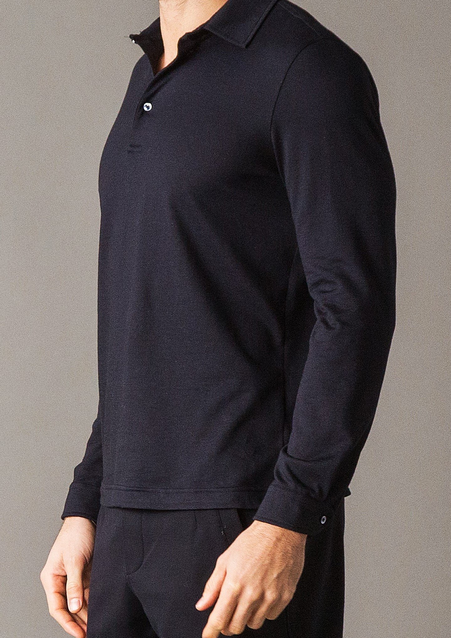 Smart and chic long-sleeve polo shirt crafted from a precious and extra-soft jersey blend of cotton, wool, cashmere, and lyocell. This refined mix of natural fibers ensures a soft touch, lightweight feel, and thermal comfort. Shirt-style collar and cuffs add a tailored finish, making it the perfect piece for relaxed yet sophisticated elegance.