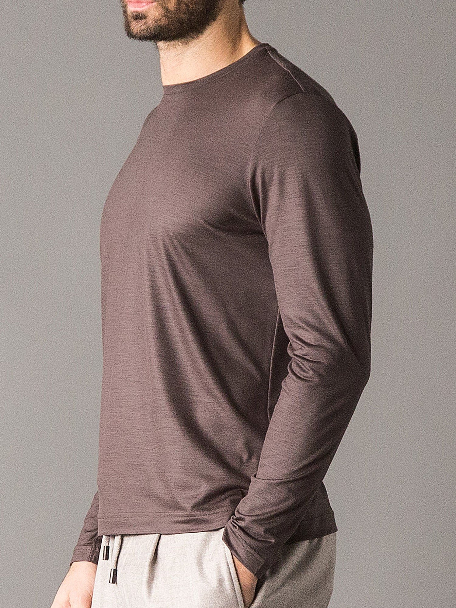 Long-sleeve crewneck T-shirt crafted from washable pure merino wool, designed to deliver everyday comfort with natural elegance. Thanks to the inherent properties of merino wool, thermal regulation, moisture absorption, and exceptional softness, this garment meets the needs of those who value both well-being and practicality.