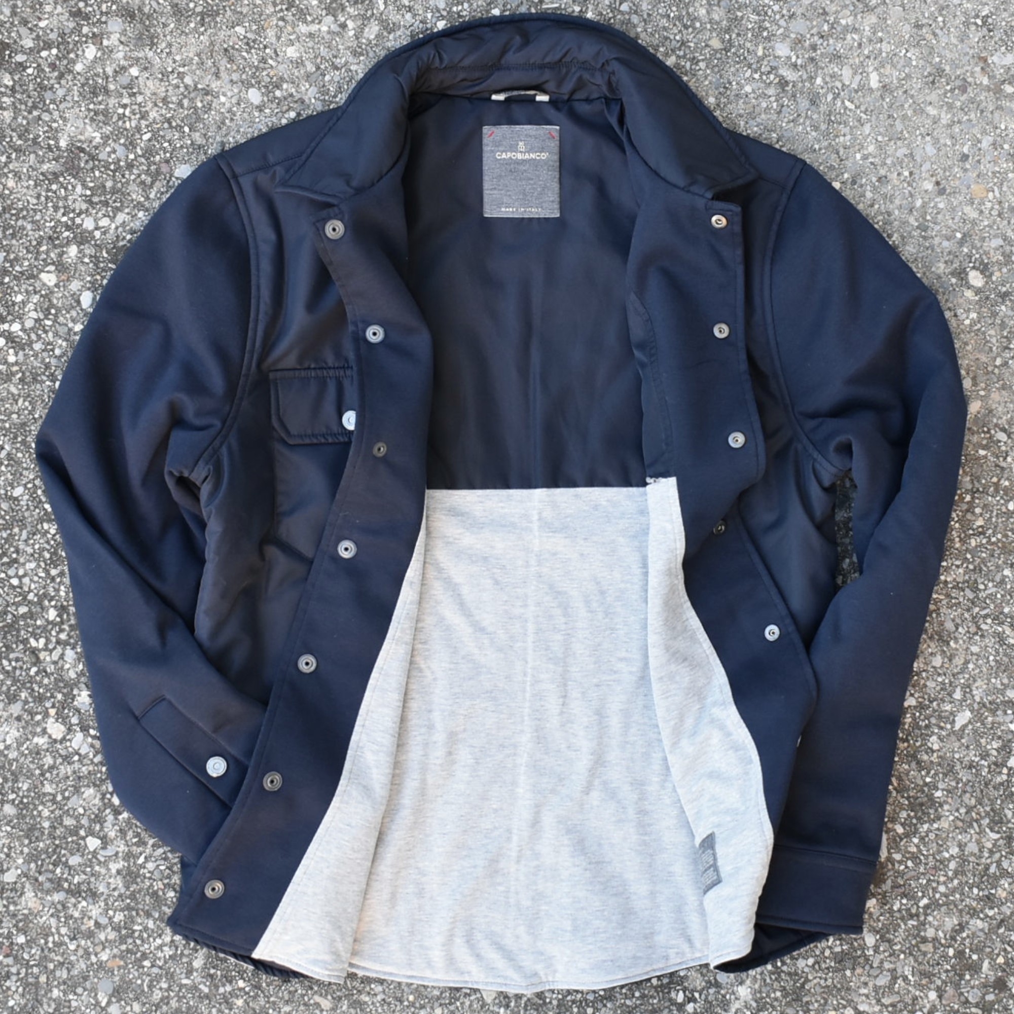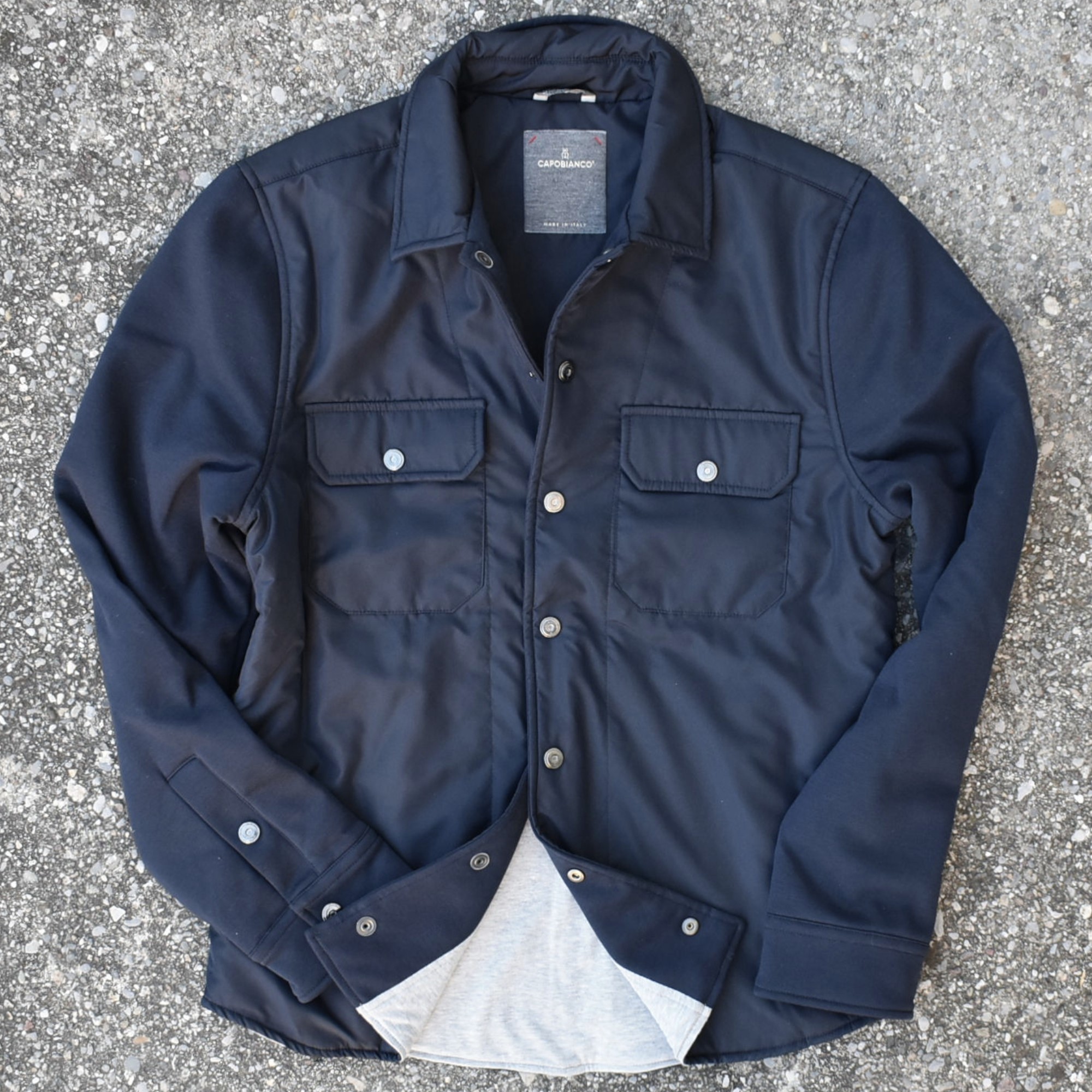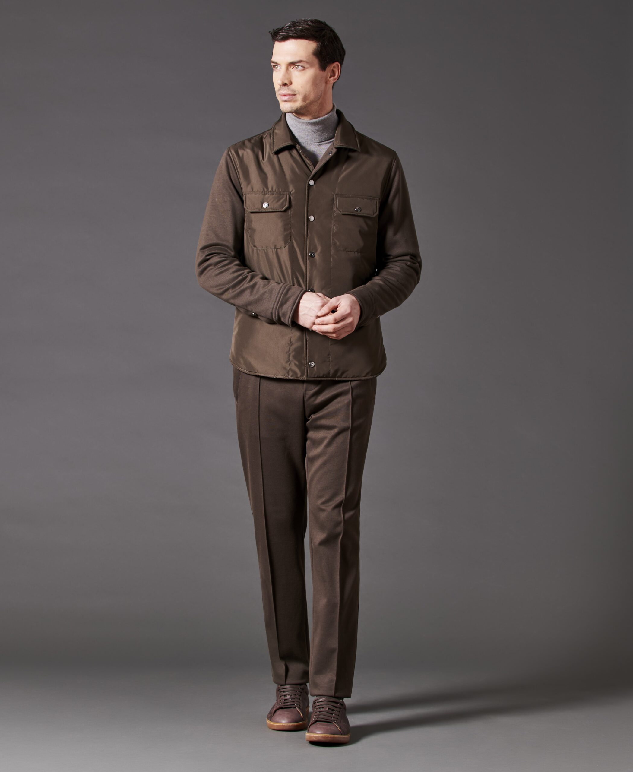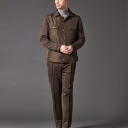 A stylish and comfortable leisure set, composed of a shirt-jacket and matching pants. The overshirt is made from soft brushed winter cotton, with the front and sleeves in recycled nylon for a modern, technical look. Logo snap buttons on the front, two chest flap pockets, and one internal chest pocket add functionality and style. The pure cotton jersey lining ensures excellent comfort against the skin, while the 115-gram pure wool padding provides warmth and lightness. The shirt-style collar, along with ribbed cuffs and hem, offers a structured and relaxed fit. The pants feature two side zip pockets, one back pocket with logo button, and a central seam on the front leg for a streamlined silhouette. The elastic waistband with drawstring and two logo-stamped metal stoppers ensures practical and comfortable adjustment.
