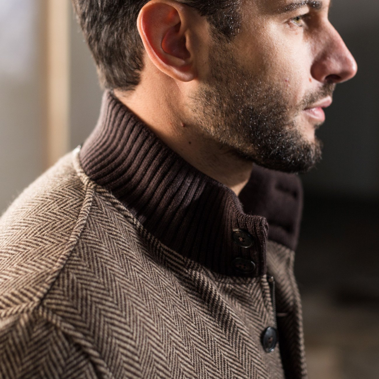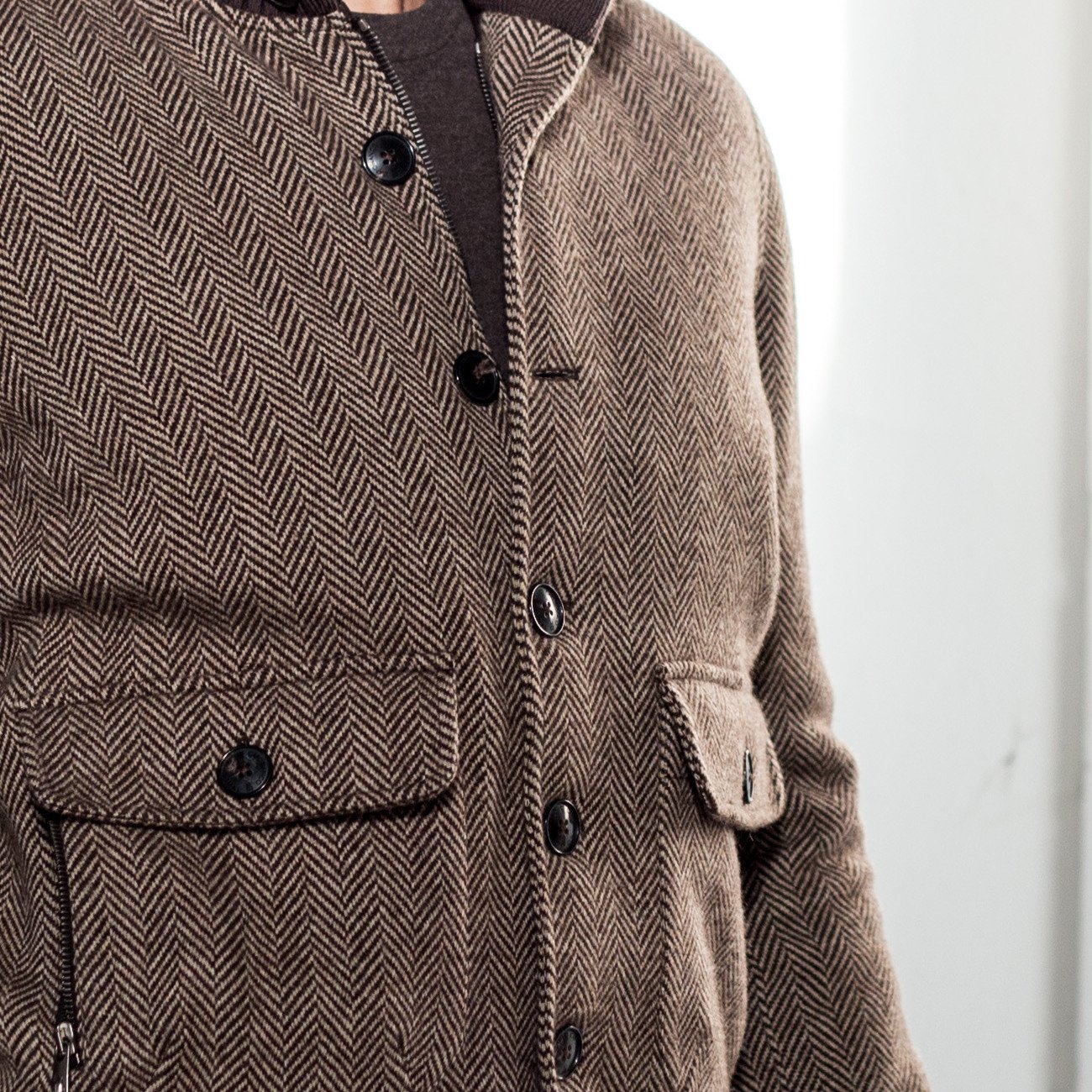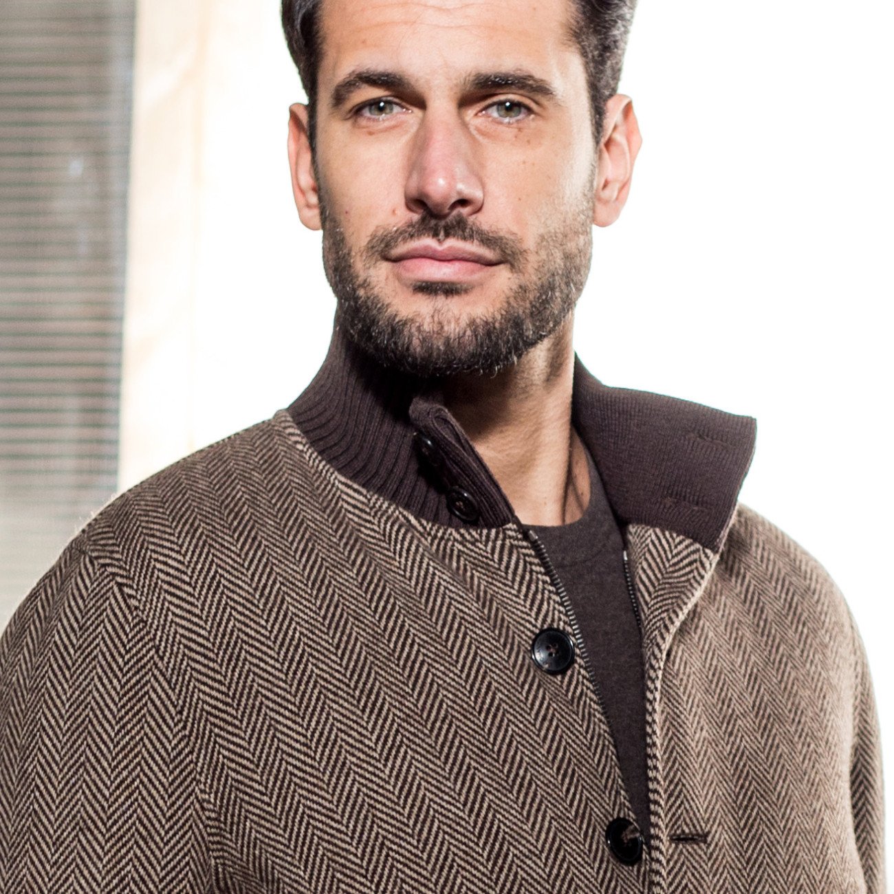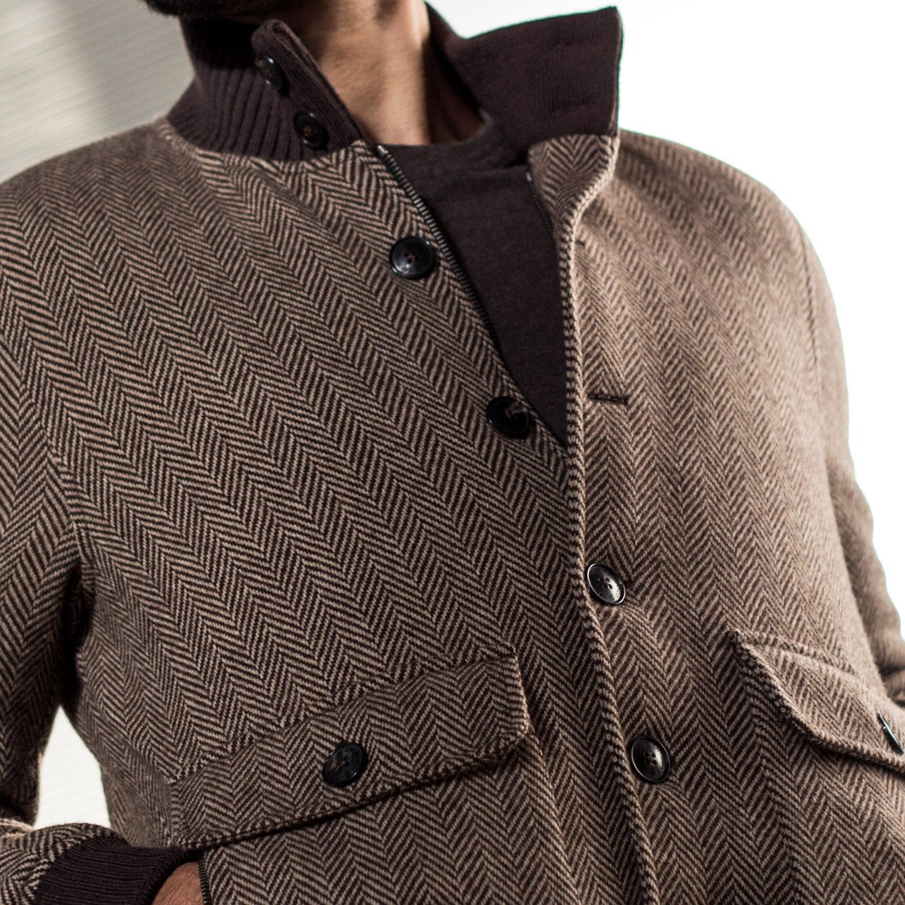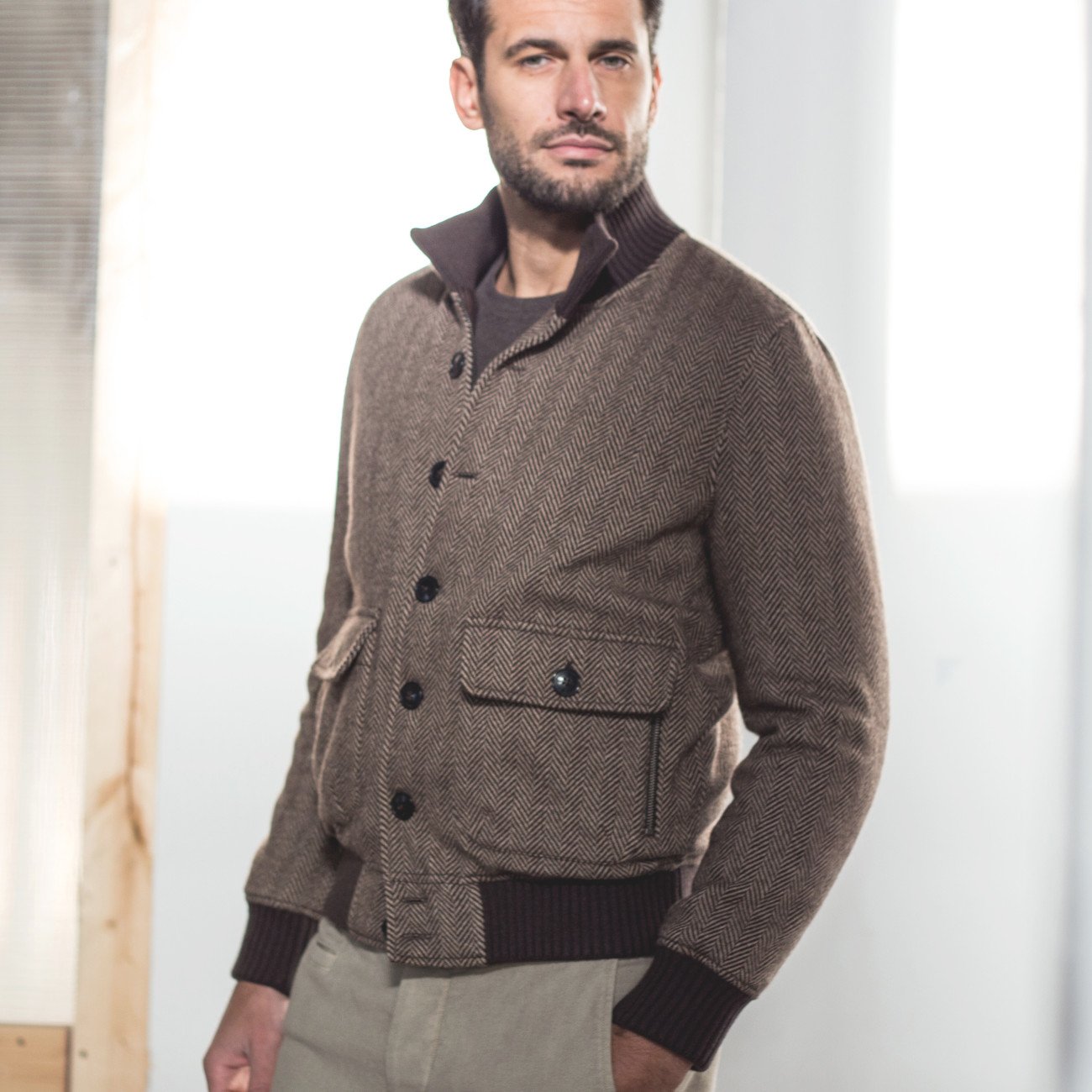 Padded bomber jacket made from a soft wool-blend fabric with a Chevron pattern, pleasantly warm and soft to the touch, ideal for the winter season. The interior features padding and a nylon lining to provide thermal protection and comfort. The collar, cuffs, and hem are finished with ribbed knit Cashwool wool. Front closure with zipper and buttons; double pockets with both types of closures.