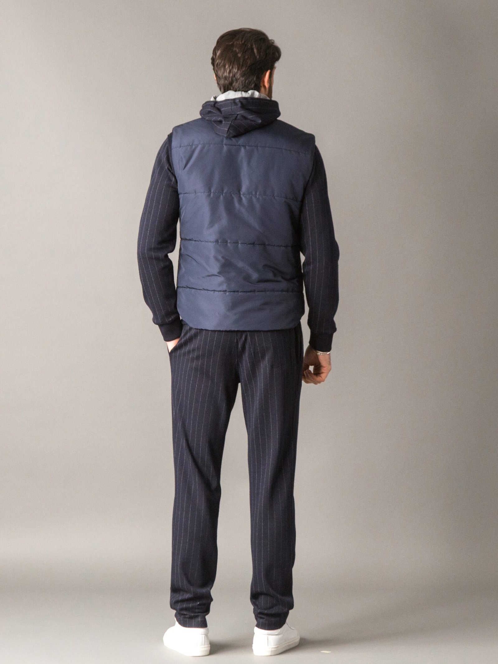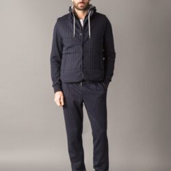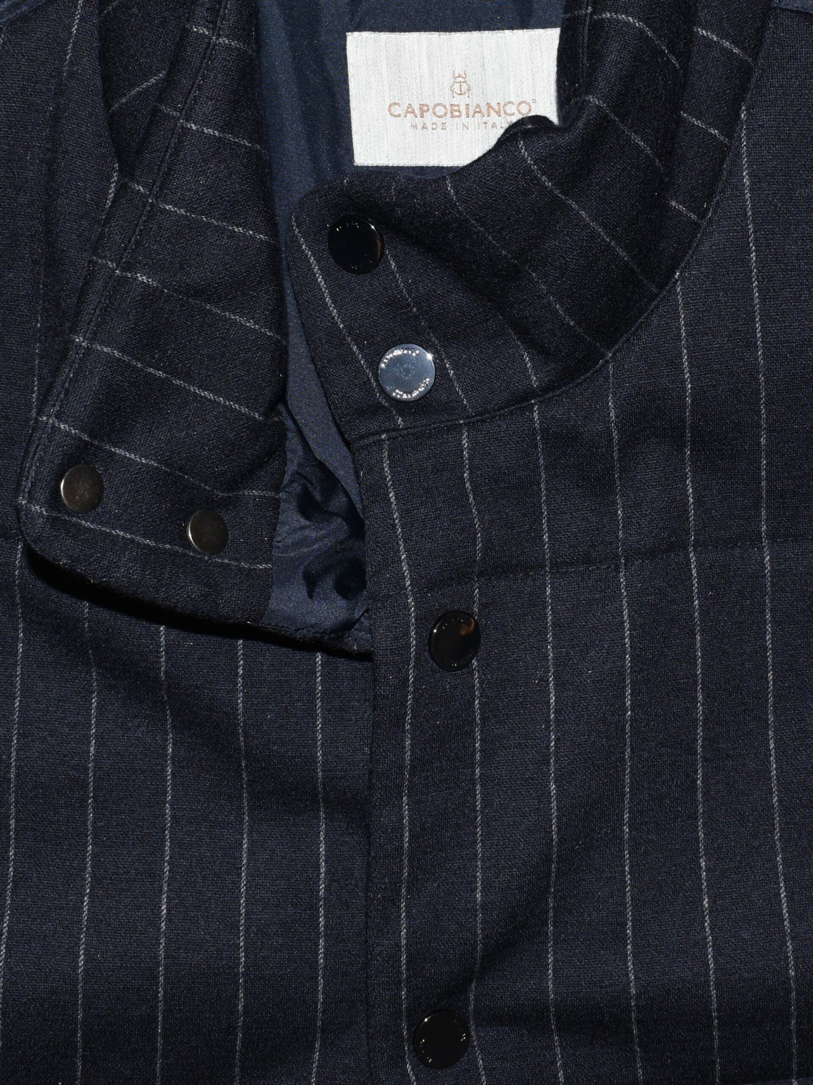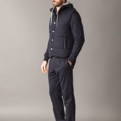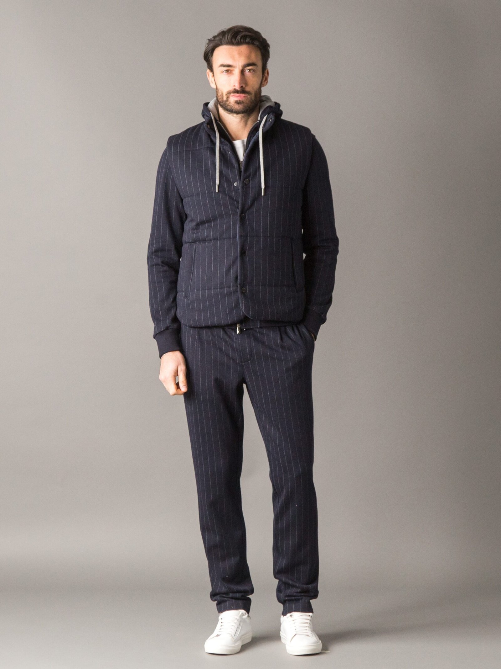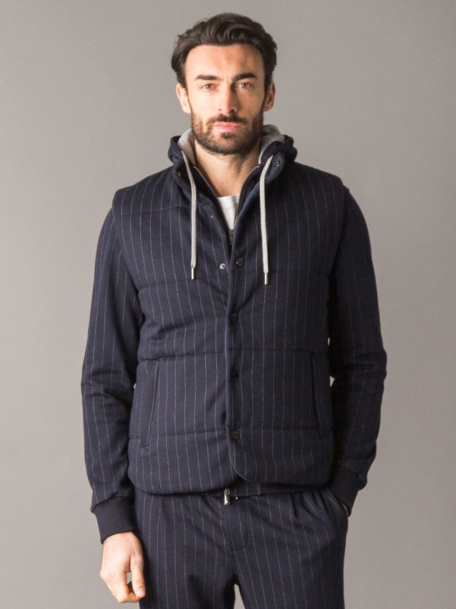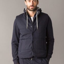 Casual yet refined vest made from premium, soft wool and warm cotton ew fabric with a pinstripe pattern, pleasant to the touch and ideal for transitional seasons. The back and inner lining are crafted from windproof polyester, while the Climalight recycled polyester wadding provides warmth and lightness. The front features branded metal buttons, two side zip pockets with branded zip pulls, and a metal logo plaque embellishes the back of the collar.