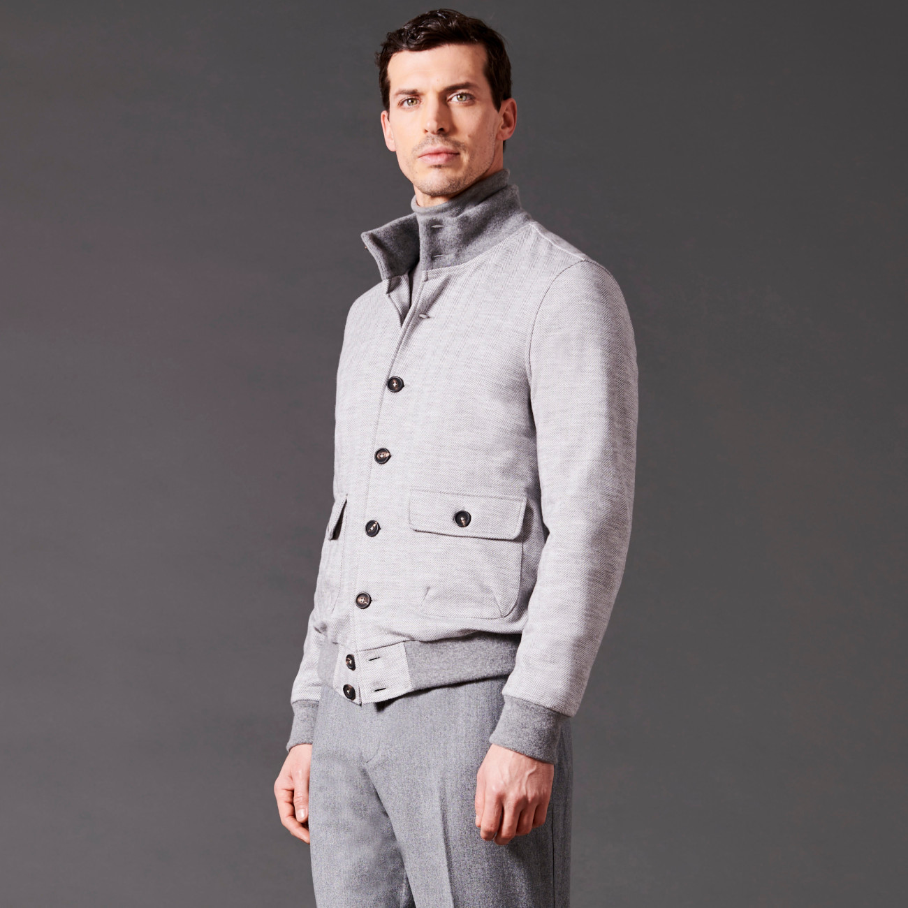 Casual and chic blouson made from precious and warm Woolcot fabric chevron design. It features knitted ribbing for the collar, cuffs, and hem, logo buttons on the front, two patch pockets with logo buttons, and an internal chest pocket. The jersey lining in pure cotton ensures maximum comfort, while a metal logo plate is located on the back of the collar.